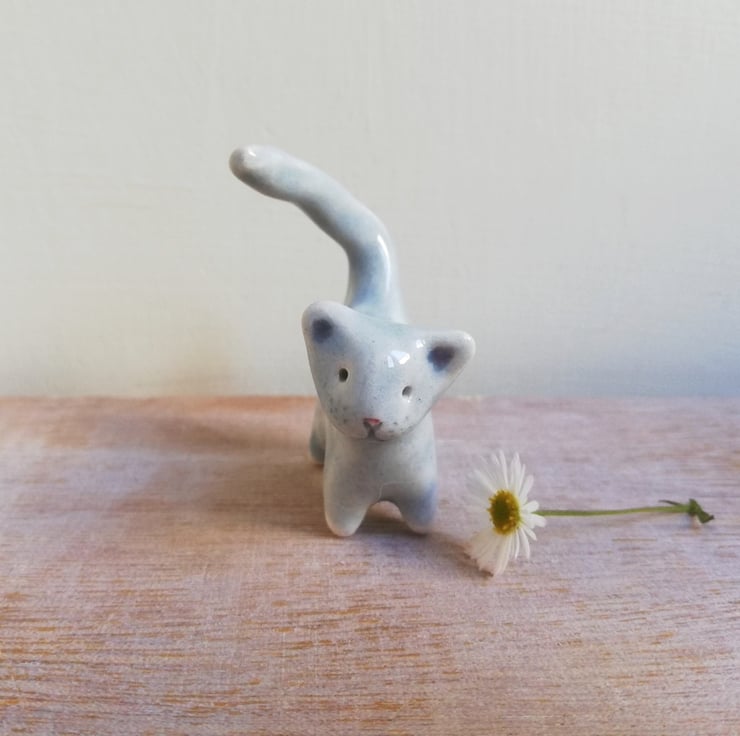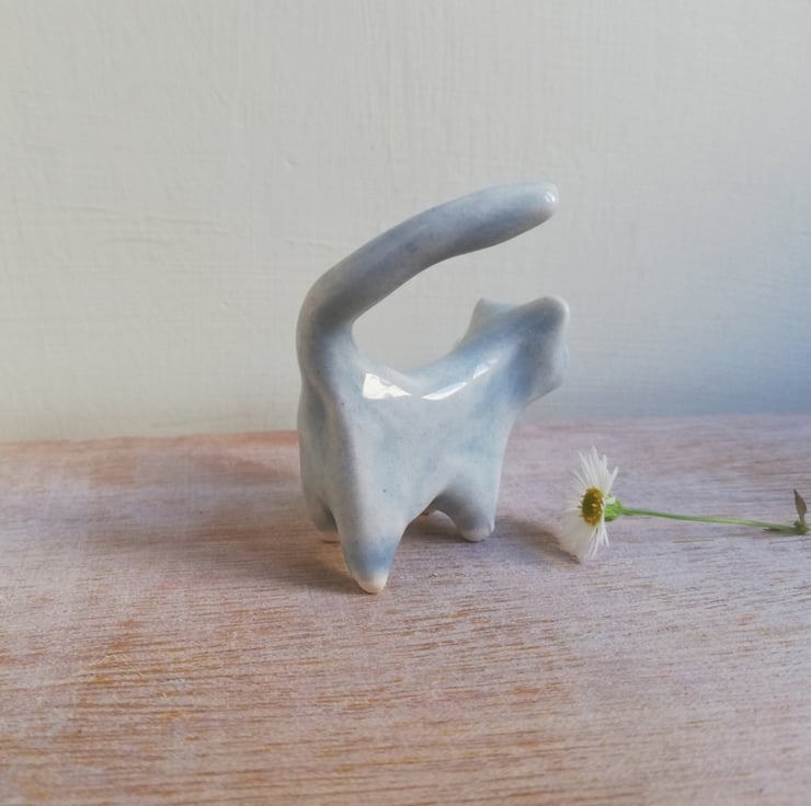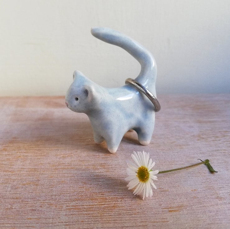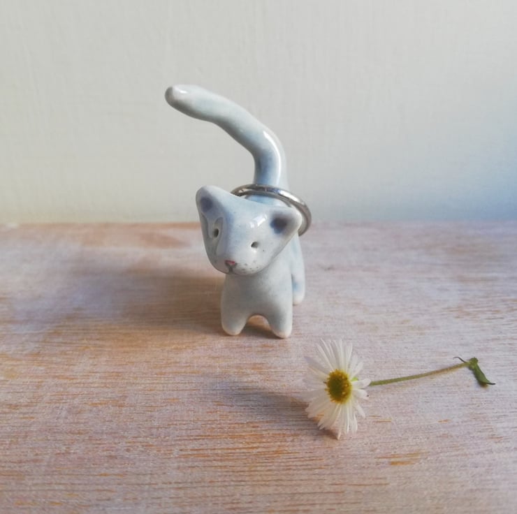 Hand sculpted cat statue ring holder . Grey ceramic kitty ornament