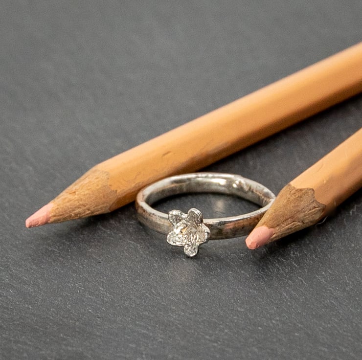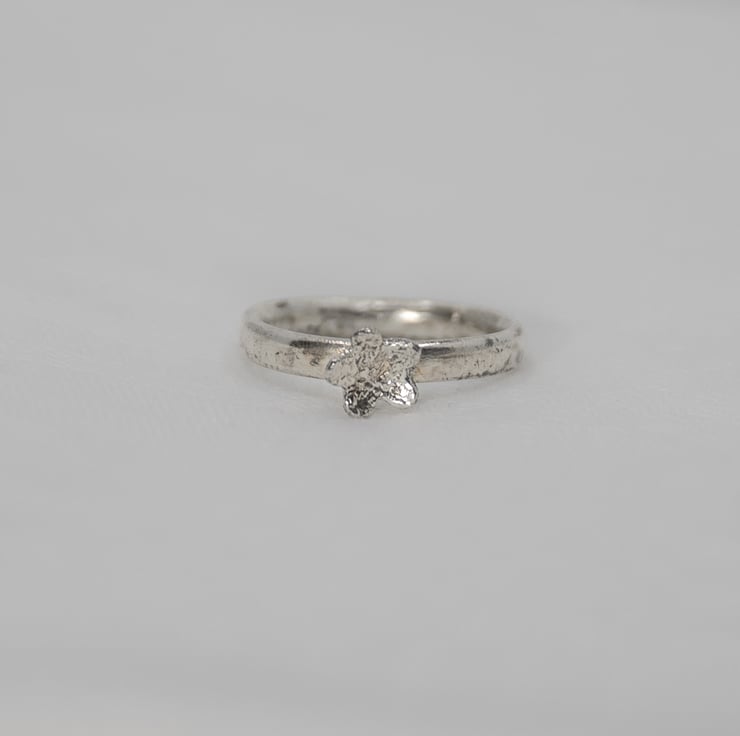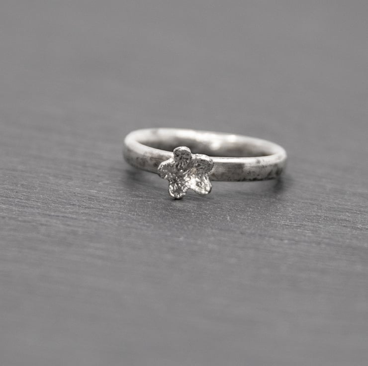 Hand made from sterling silver wire this dainty ring has a small flower on it.