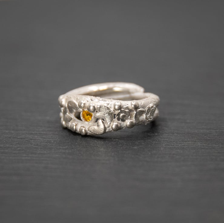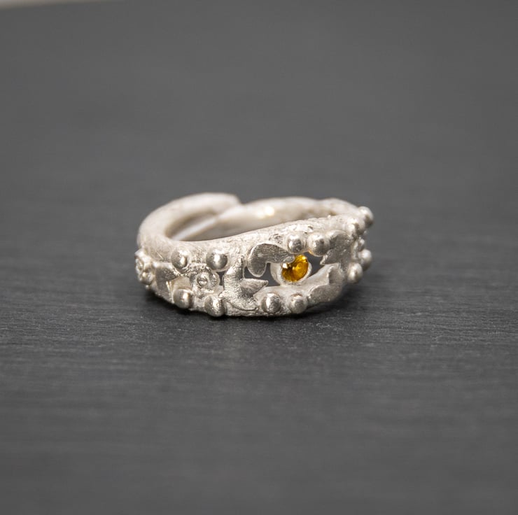 This ring was hand made using silver clay. It is decorated with leaves and flowers and has a yellow cubic zirconia stone at its centre.