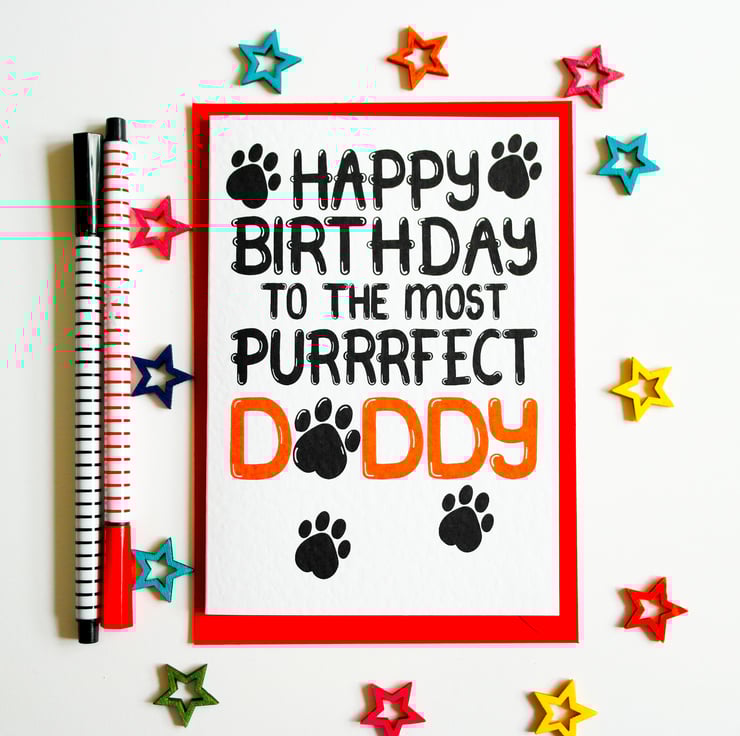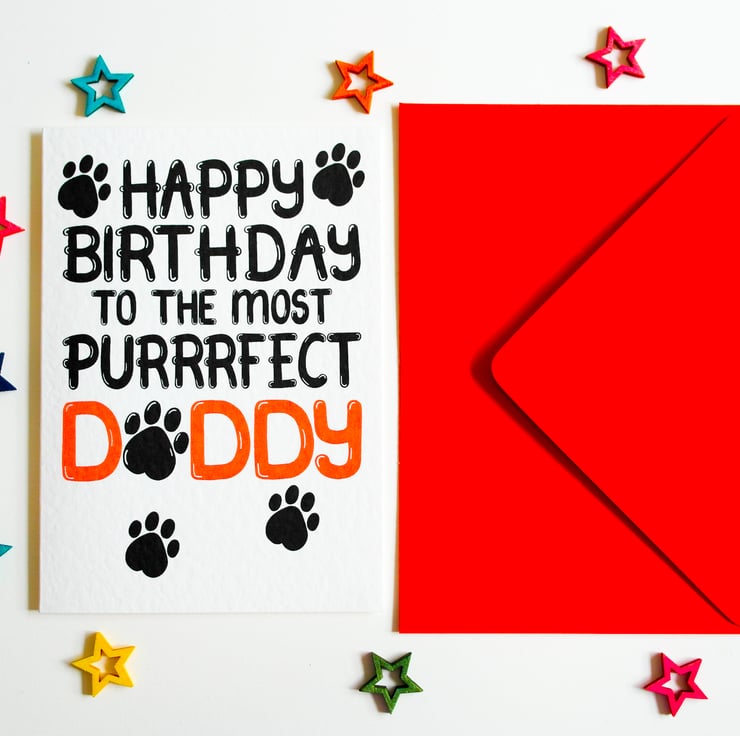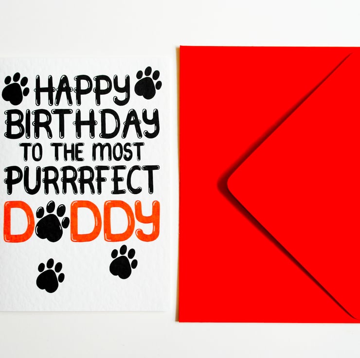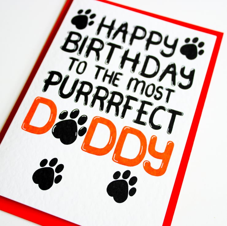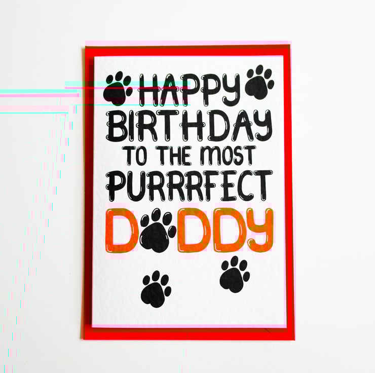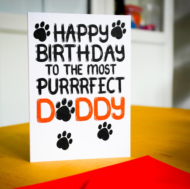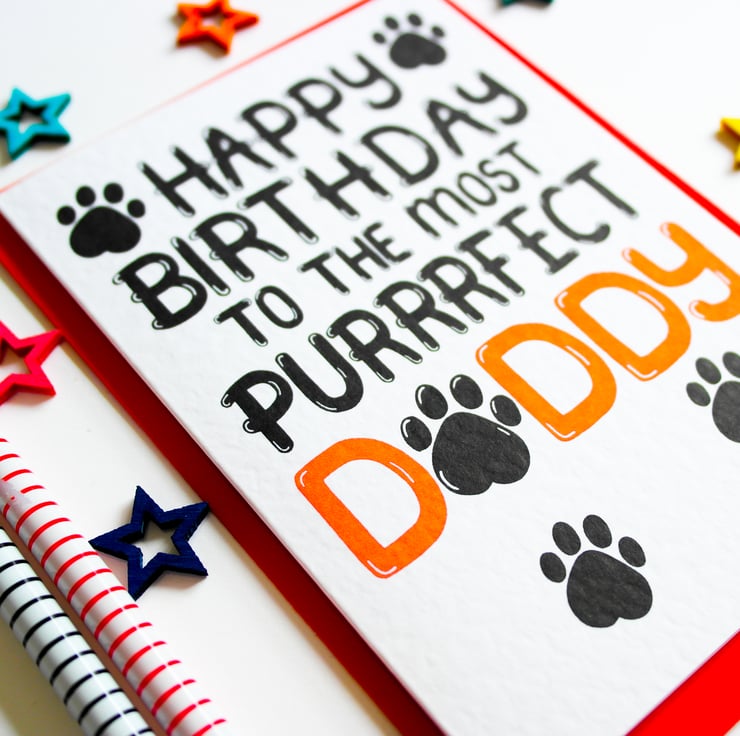 Greeting on front: HAPPY BIRTHDAY TO THE MOST PURRRFECT DADDY
