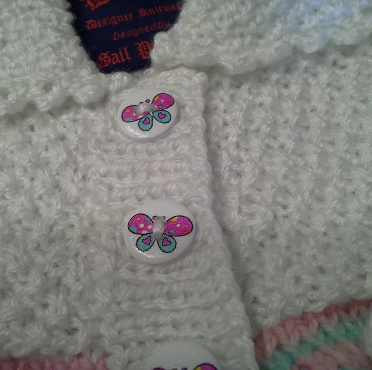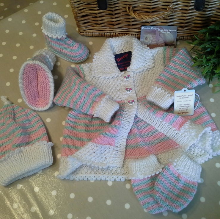 A beautiful practical baby girl's full layette/matinee set has been designed and lovingly hand crafted 8n Cornwall using quality mixed fibre yarns containing wool, cotton and acrylic. The yarns are extremely soft to the touch and the set will keep baby cosy and warm with the added advantage of having the mixed natural fibres allowing baby's skin to breath. The yarns are machine washable at low temperature settings. The buttons are made from genuine wood with a dedicate flower design on them. The edges to the jacket, hat, booties and mittens have a delicate hand crotchet picot edge trim.