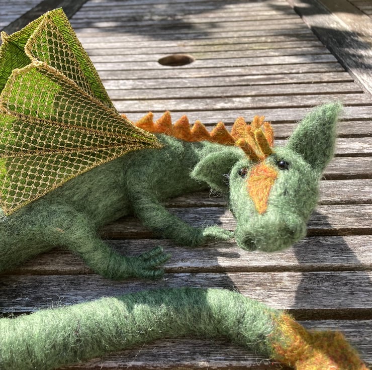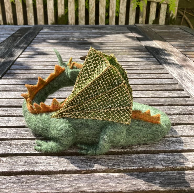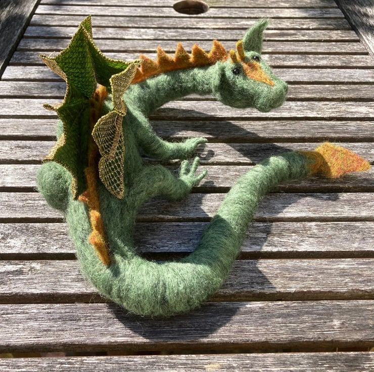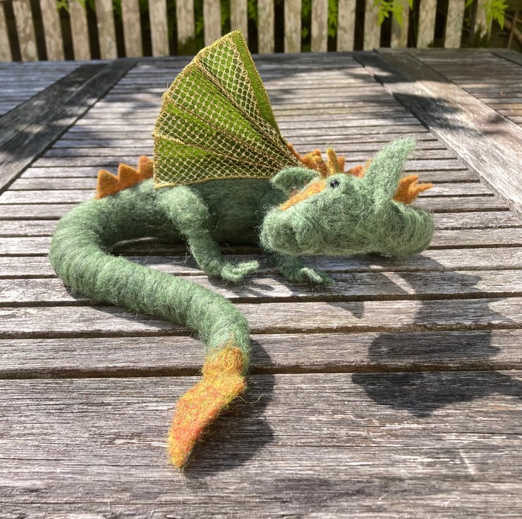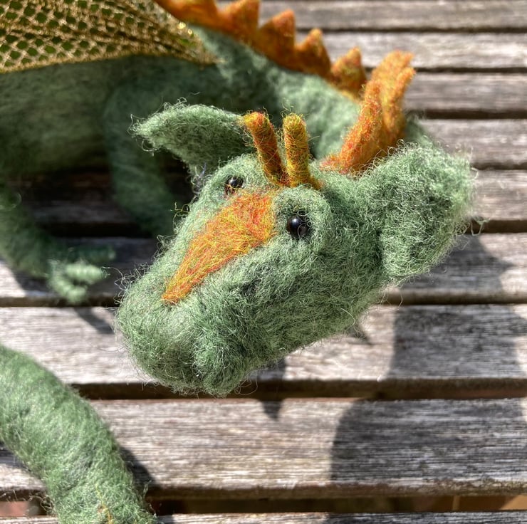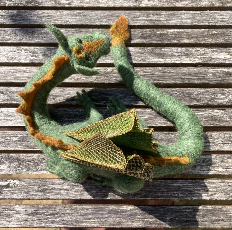 This gorgeous dragon waking from a deep slumber has been needle felted using woollen fibres. Core wool has been sculpted into shape using a barbed felting needle and a colour top coat added. The dragon has a green colour for his body with a yellow blend used for the spikes along his back and his facial highlights. The dragon has been felted over a wire armature making his body and legs slightly poseable although care should be taken not to move his pose too much as this will loosen the woollen fibres. The wings have been made using a green silk fabric overlaid with a gold coloured net and have been stitched into place. Black half pearls have been used for the eyes.