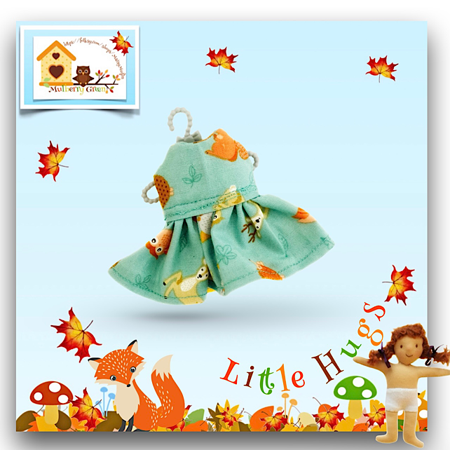 A little woodland creatures print dress made especially to fit the Little Hugs dolls or baby Daisy. The dress is made from best quality cotton and has a lined bodice and gathered skirt. It fastens at the back with a little popper and comes on a cute little hanger.