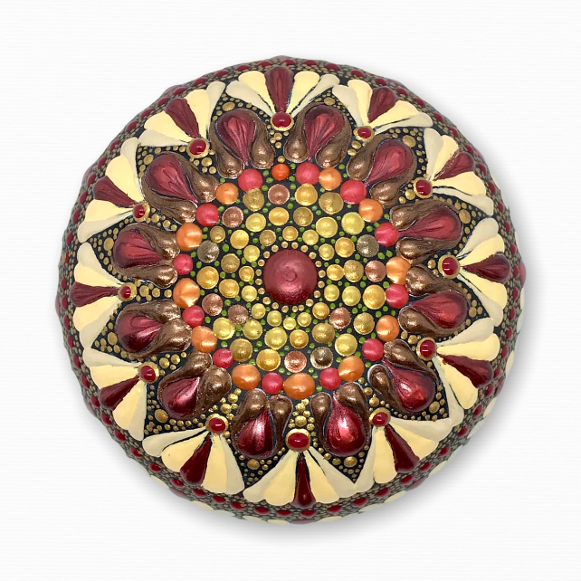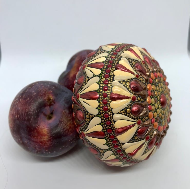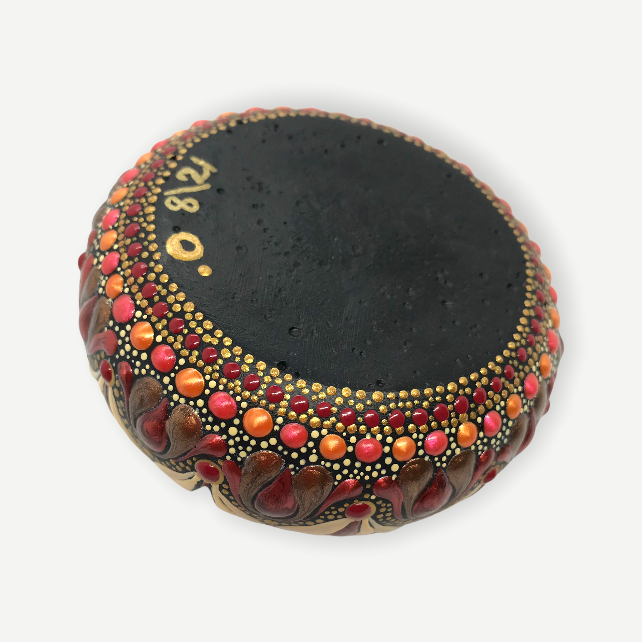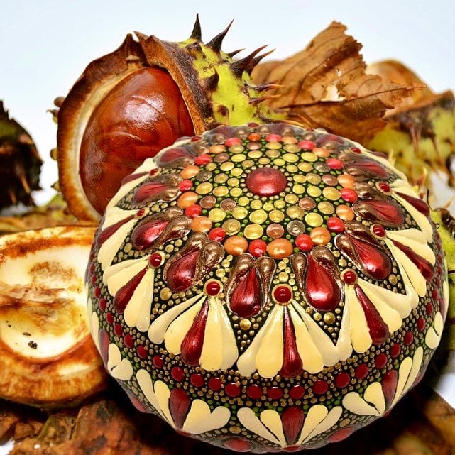 The weather felt decidedly autumnal for mid-August, and I began to think of the approaching autumn season … falling leaves and conkers! This little conker-inspired piece is a unique one-of-it’s-kind “stone” for mellow and mindful meditations. The paint is thick and smooth and tactile and the stone feels good in the palm of your hand. I have signed the base with my mark “.o” and I have also applied a soft pad to the base to protect any delicate surface it may be placed upon. I think it would make a lovely and unique gift for a gentleman’s study or office.