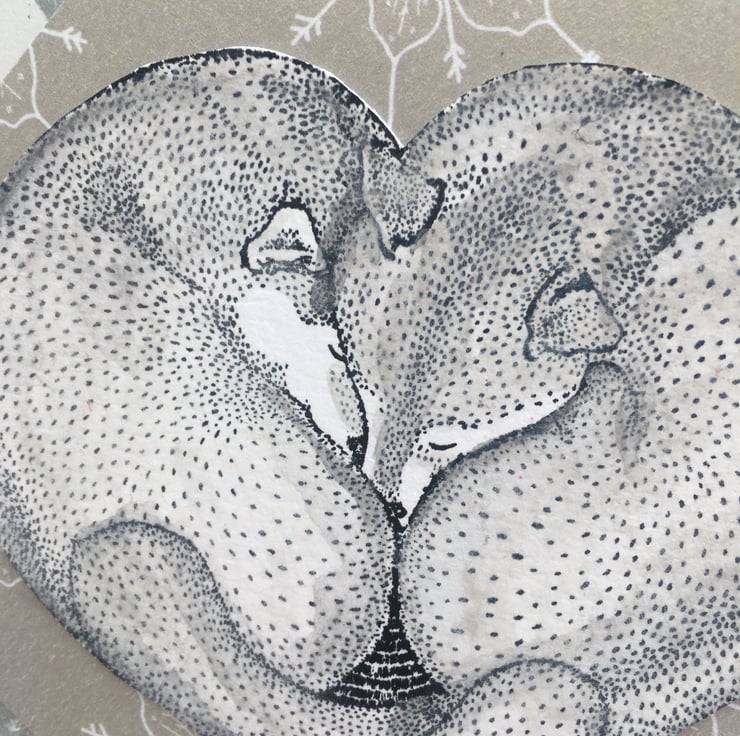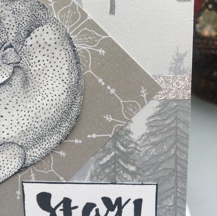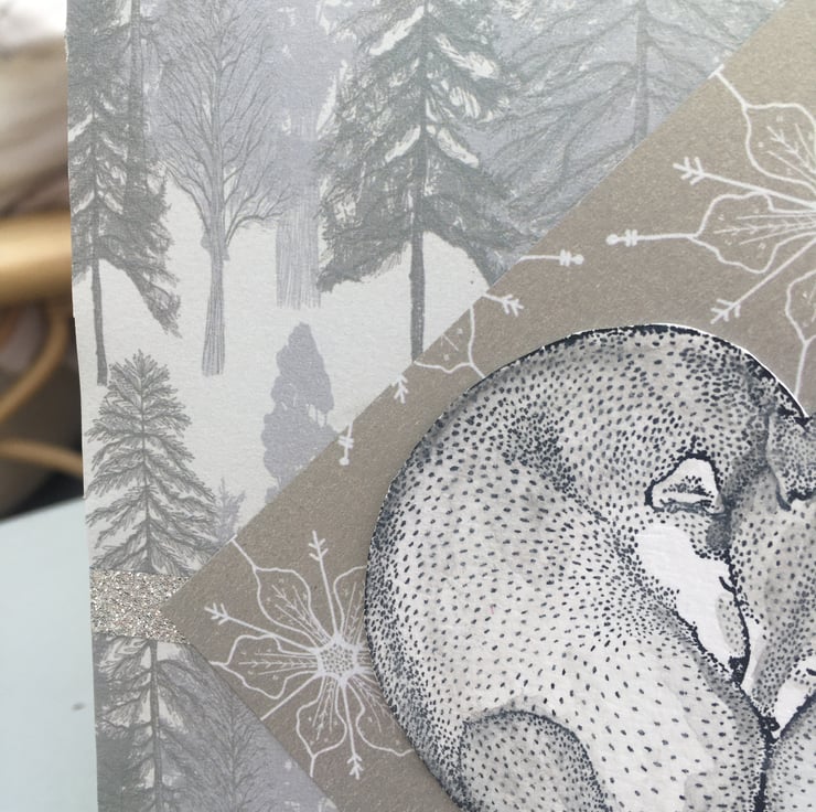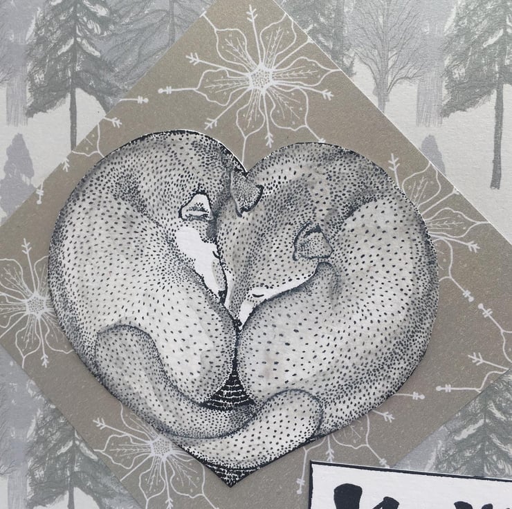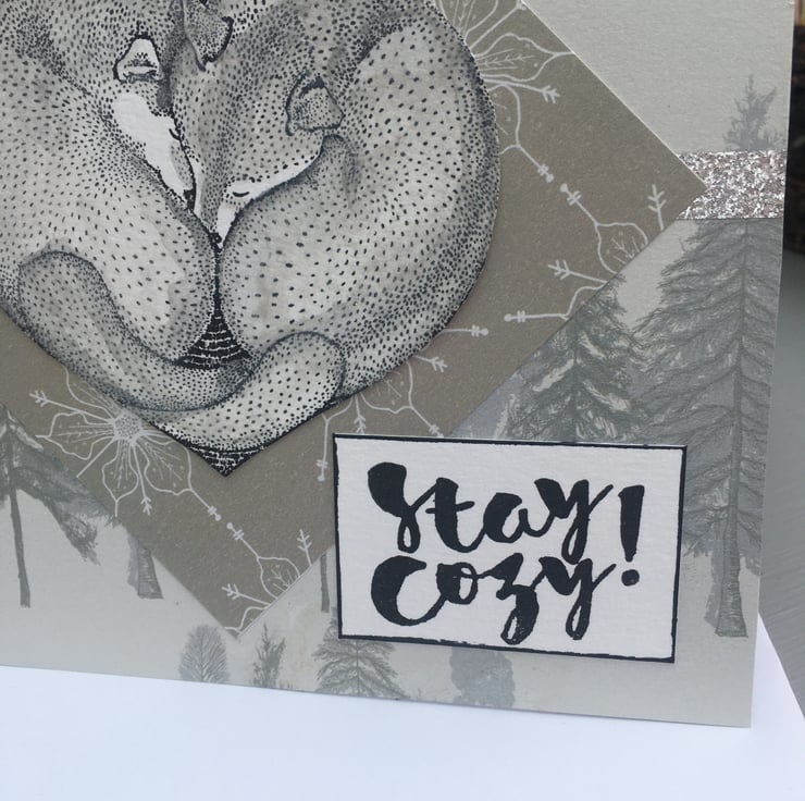 A cute and cozy card featuring arctic foxes curled up together. The card is 15x15cm square with a background of silver fir tree paper. The foxes are stamped and coloured with a pale grey to make them arctic foxes. They are curled up asleep together. They form a heart, this is mounted on silvery gold paper with poinsettias on it. A stay cozy greeting is on the side. It has no specific greeting so could be used for a christmas card, winter anniversary or wedding card.