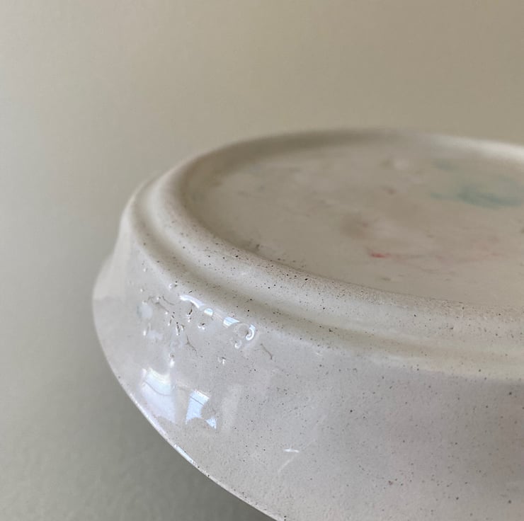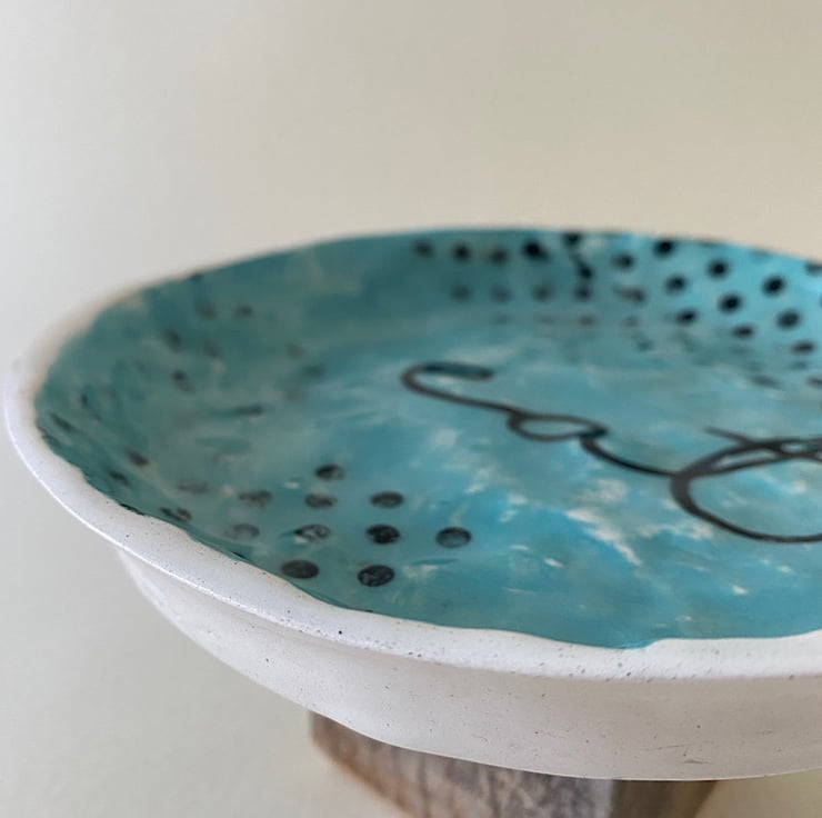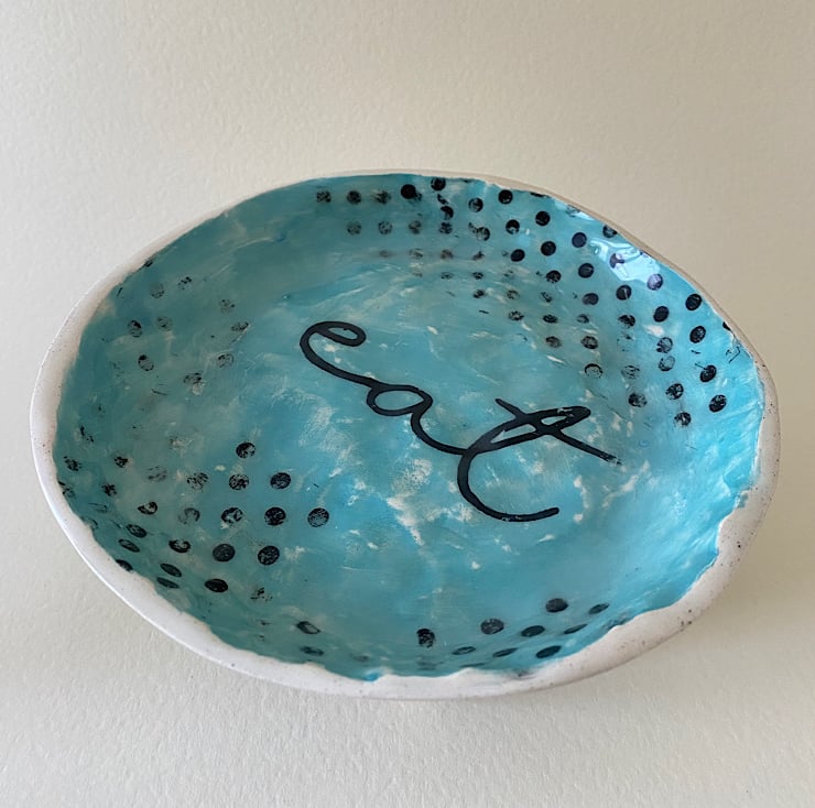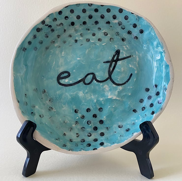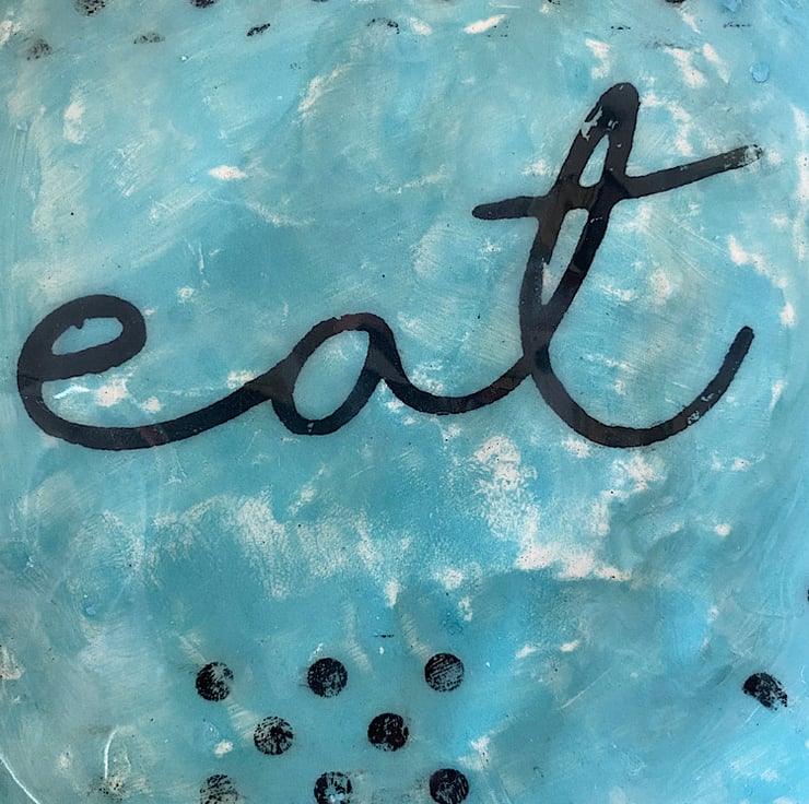 Handmade decorative plate. Made with creamy earthenware clay, decorated with a variety of techniques. Areas are hand painted and screen printed. A large sweep turquoise and black spots sit under the word “Eat”