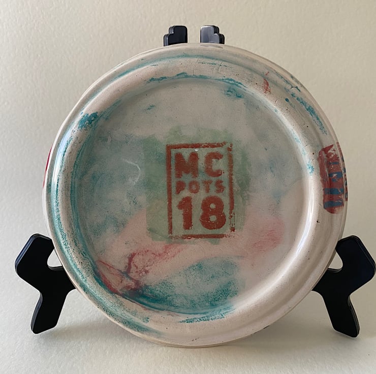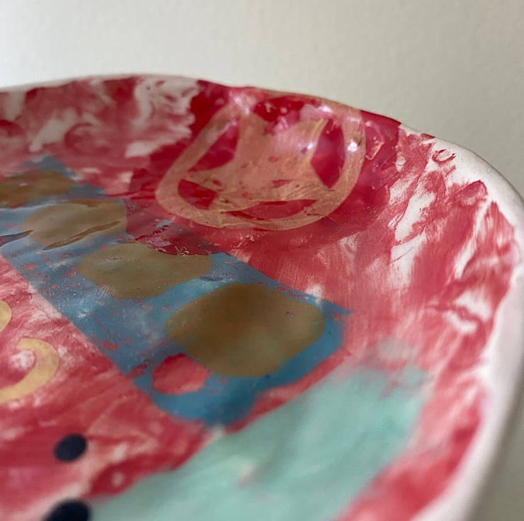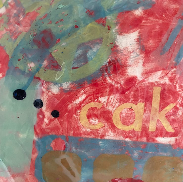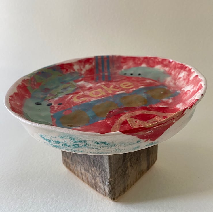 Handmade decorative plate. Made with creamy earthenware clay, decorated with a variety of techniques. Areas are hand painted and screen printed. A large sweep of red sits under a variety of colours and patterns. “Cake” feature (on the plates and in my life!) Wonderful fun to make and decorate and sometimes you just need to do what it says on the plate!