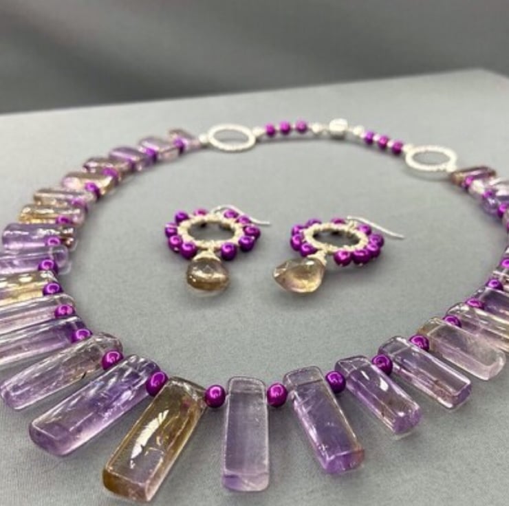 This beautifully subtle two-tone necklace and earrings set features the stunning ametrine gemstone partnered up with a Cadbury purple coloured cultured near round pearls.