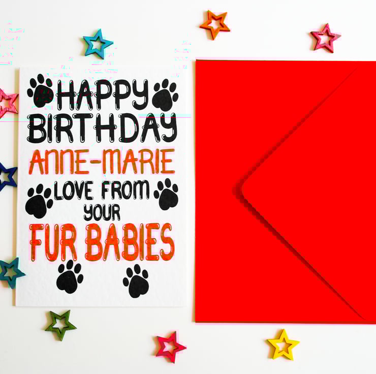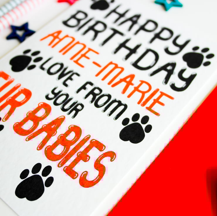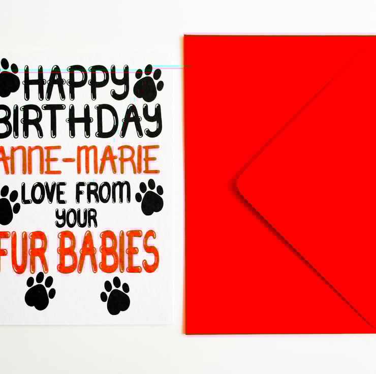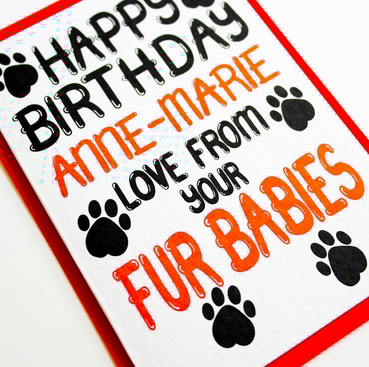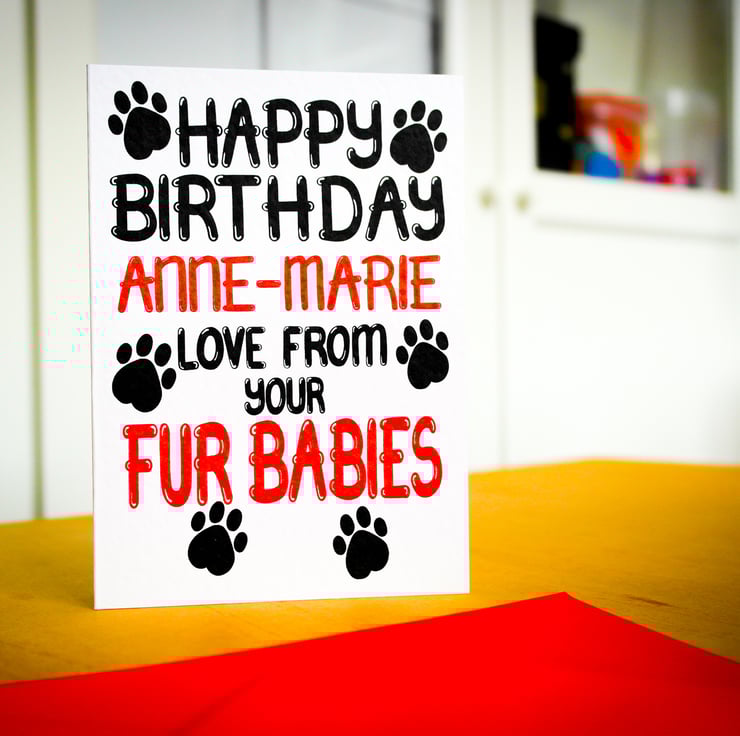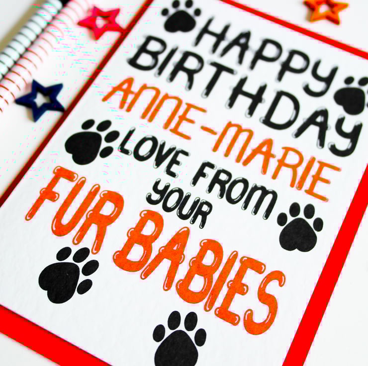 Greeting on front: HAPPY BIRTHDAY (NAME) LOVE FROM YOUR FUR BABIES