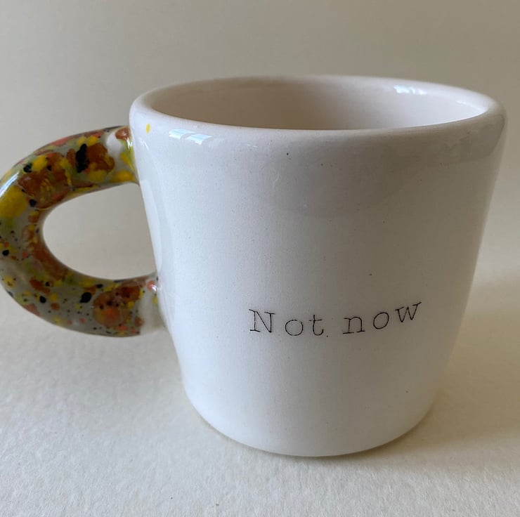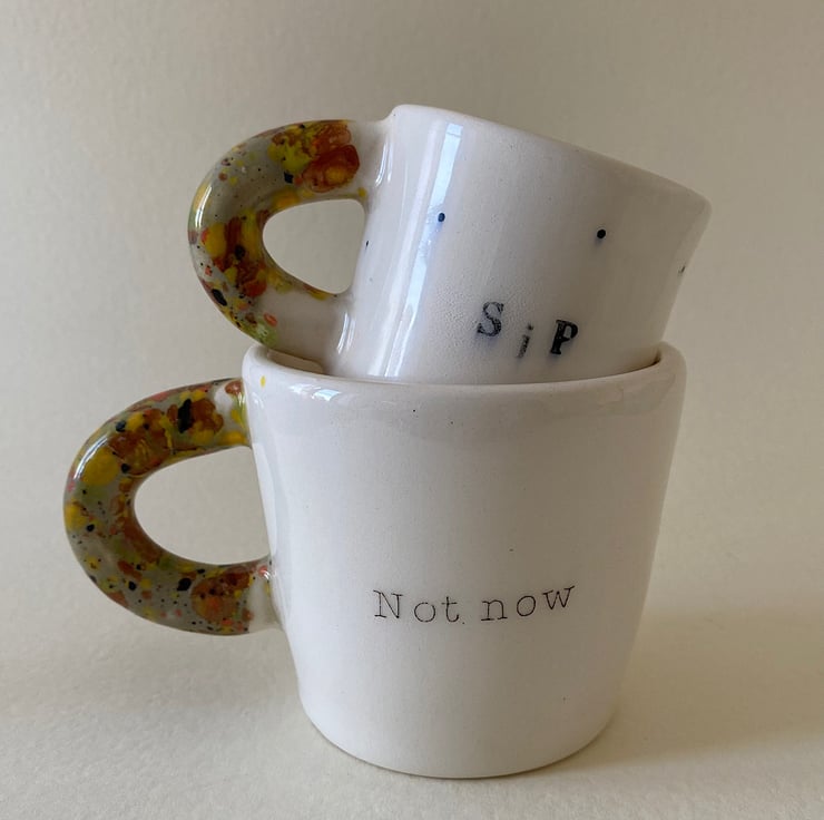 A simple design with “Not today” and “Sip” decoration made with handmade ceramic decals.