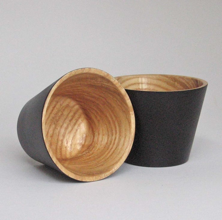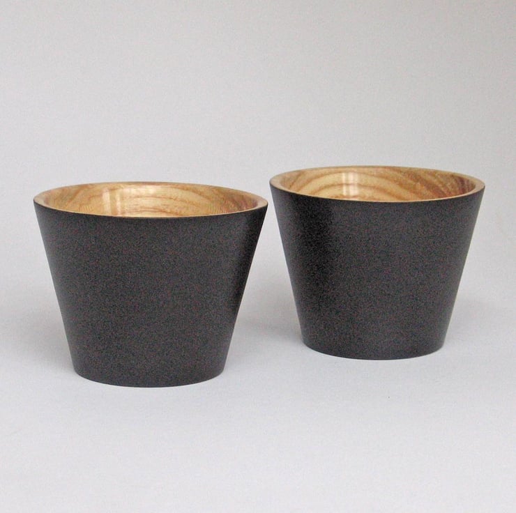 A pair of exquisite pots turned in ash. Internally they have been given a lacquered, hard wearing and food safe finish. Externally they have been given a coloured and lacquered finish. Currently I have two sets available either in blue or black.