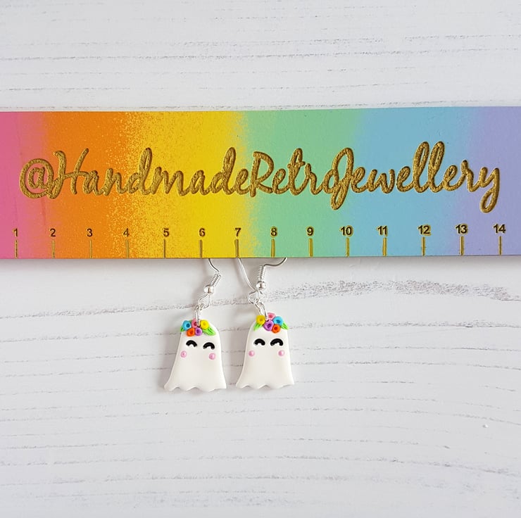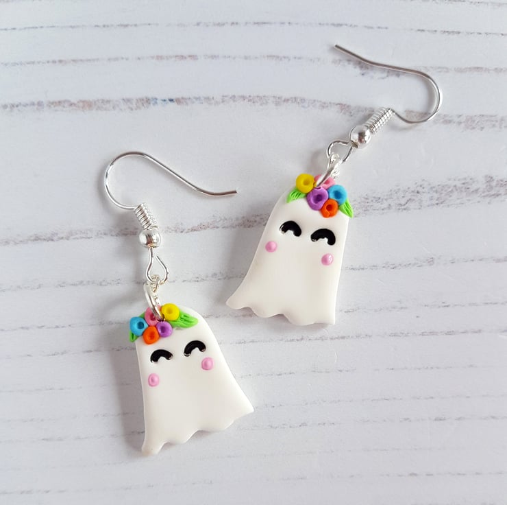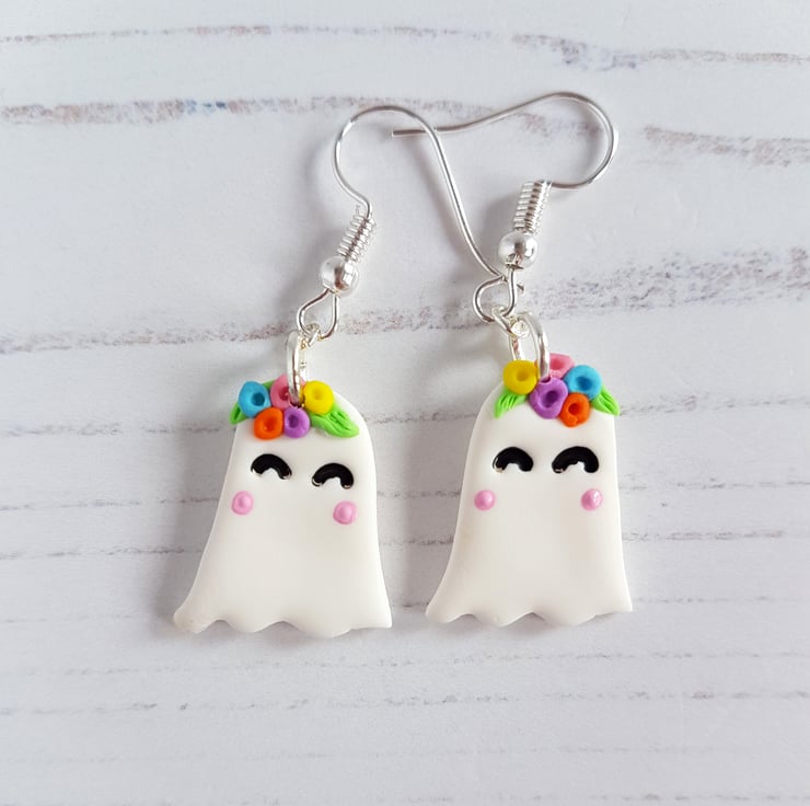 These pretty earrings have been carefully hand crafted using white polymer clay, with some brightly coloured flowers and leaves added to create a crown. A cute face is then hand painted using acrylic paint to finish. The ghosts are then fixed onto silver plated hook style fixings for a drop effect.