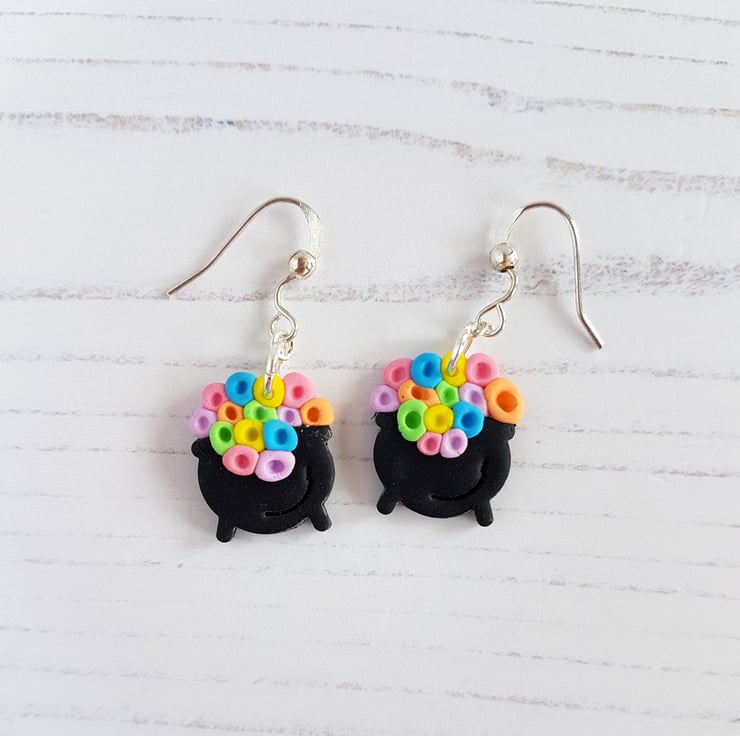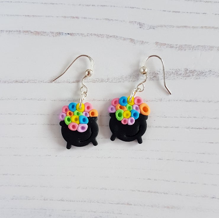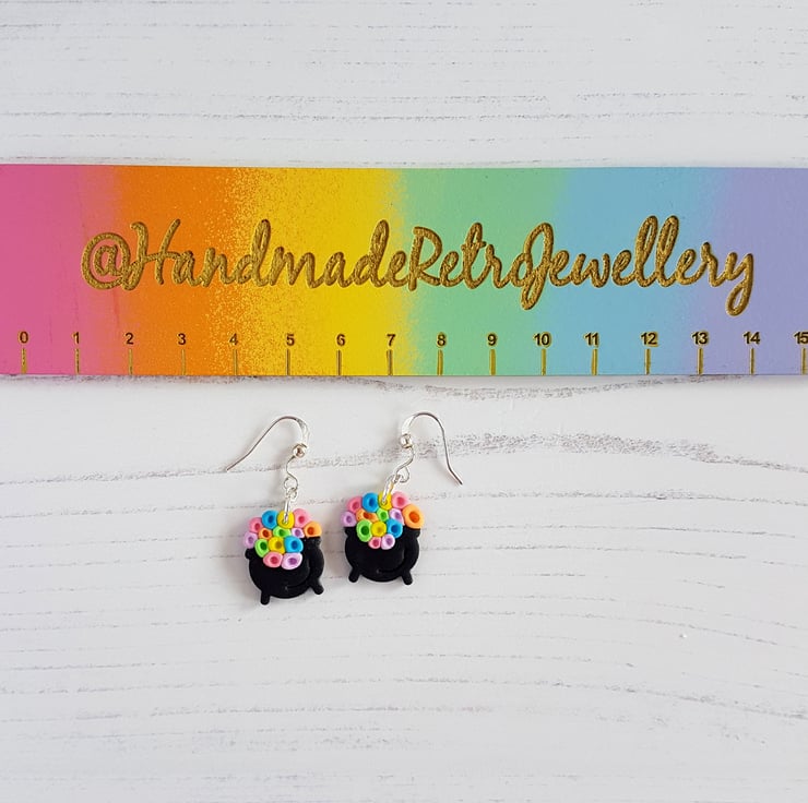 These pretty earrings have been carefully hand crafted using black polymer clay, with some brightly coloured bubbles added to the top, overflowing in a rainbow potion spell!