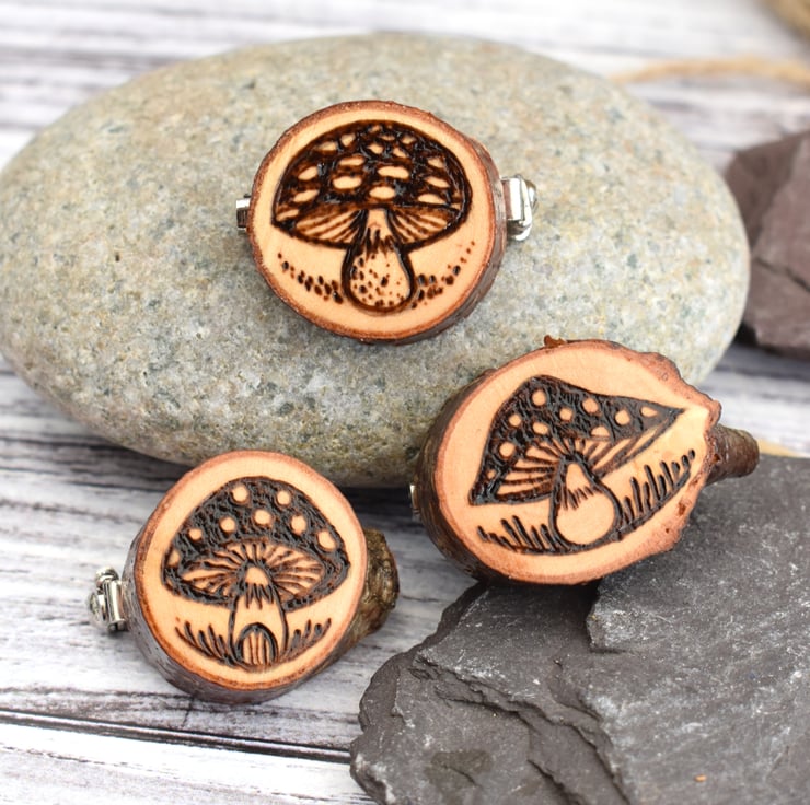 A toadstool adorns this teeny branch slice brooch, hand burned using pyrography.
