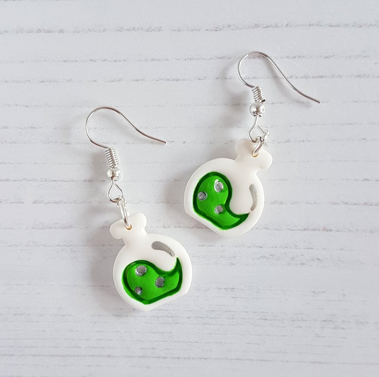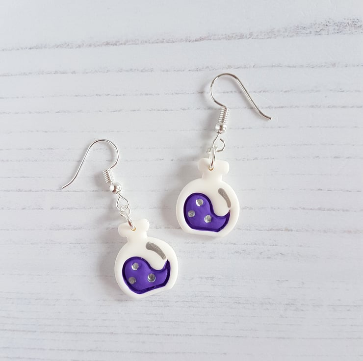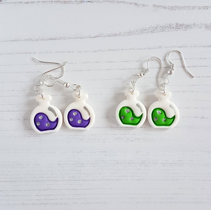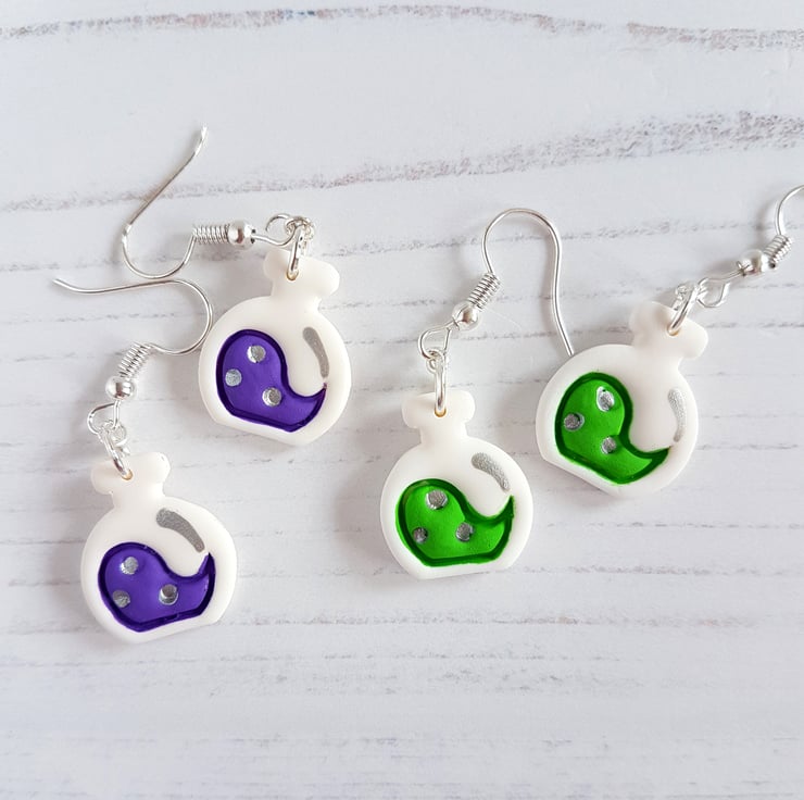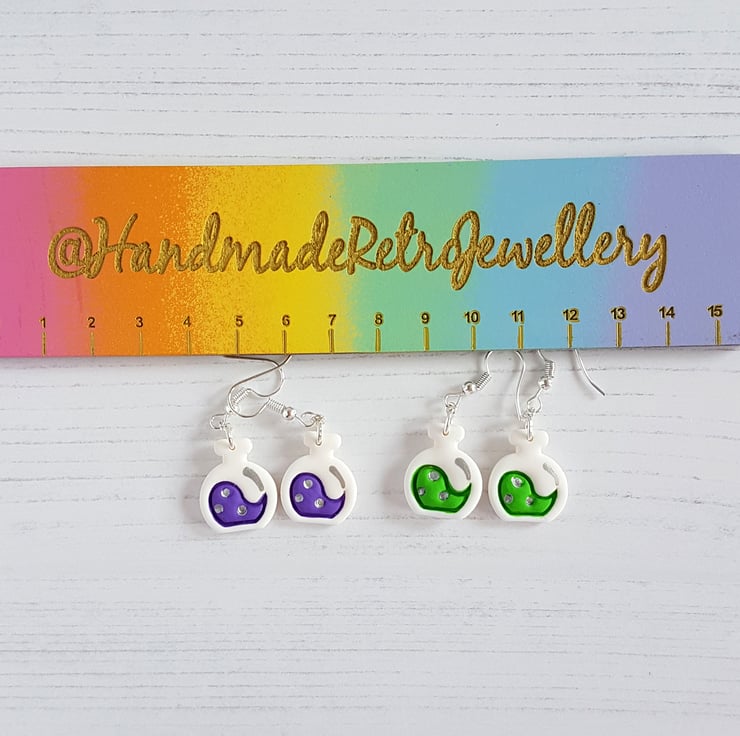 These bold earrings have been carefully hand crafted using white polymer clay, with your choice of colour potion inside the bottle! Detail is painted using acrylic paint - choose any colour for your potion, with silver paint added for detail to finish.