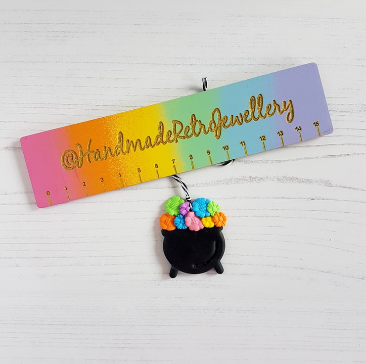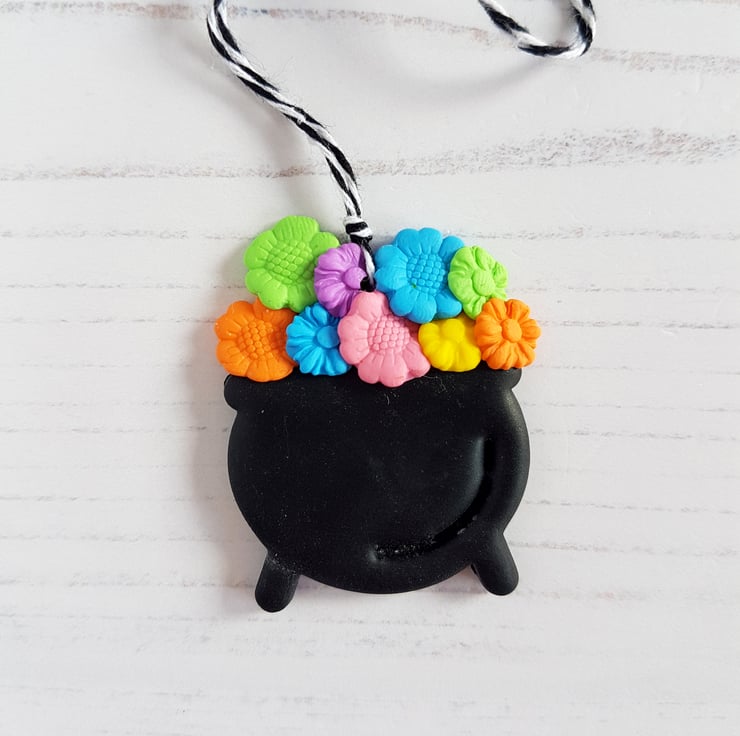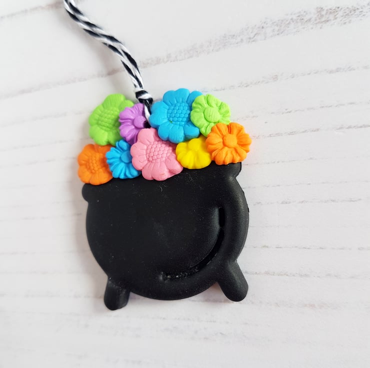 A beautiful cauldron themed decoration, made from black polymer clay, with a bloom of rainbow coloured flowers spilling out of the top - the perfect spell for your home!