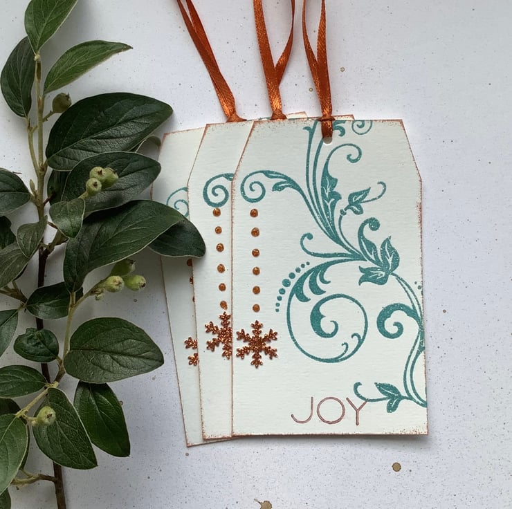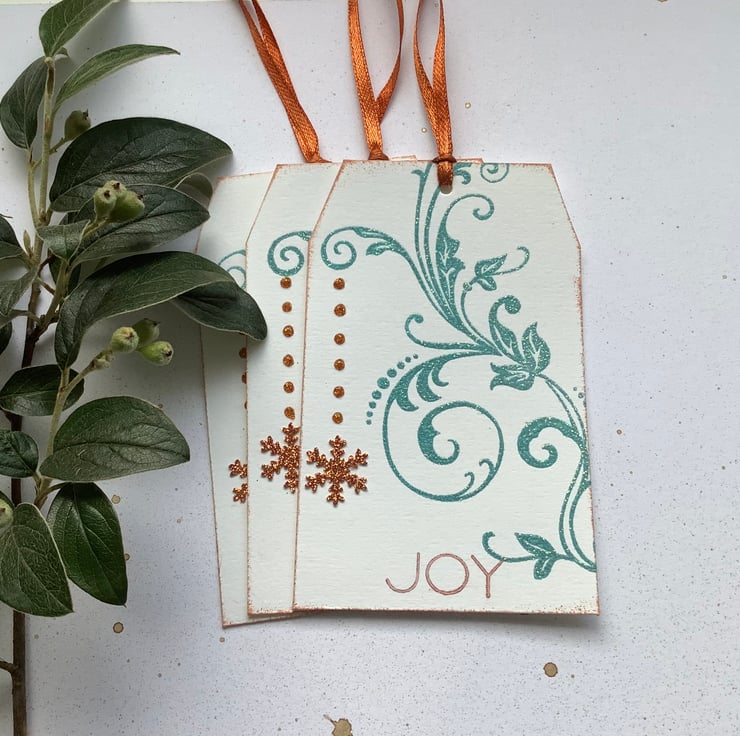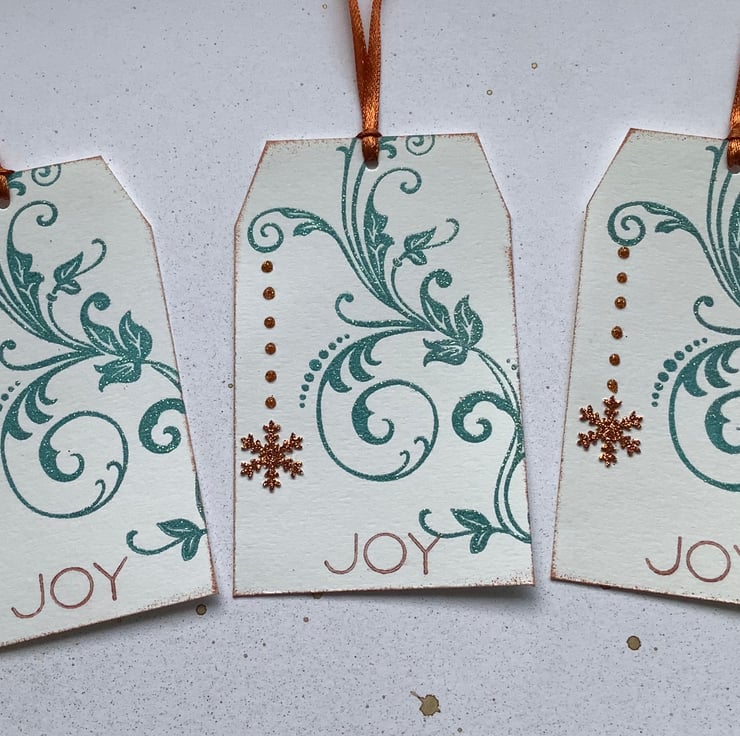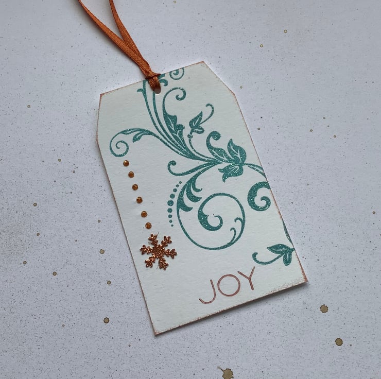 I have created these luggage-tag style tags using a lovely , elegant swirl / flourish design . Stamped and embossed on to white card (285gsm) . Lots of shimmer with iridescent powders and inks and then tied with silky ribbon for tying to that special gift. !!