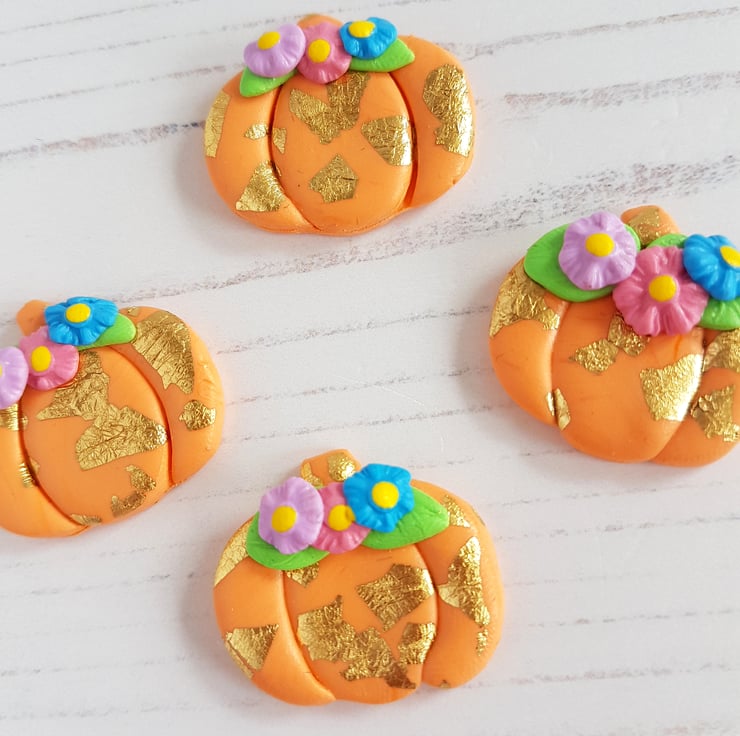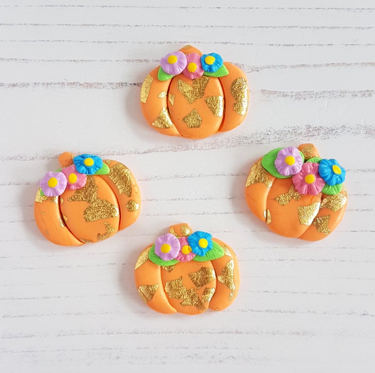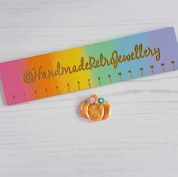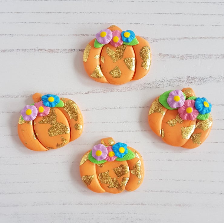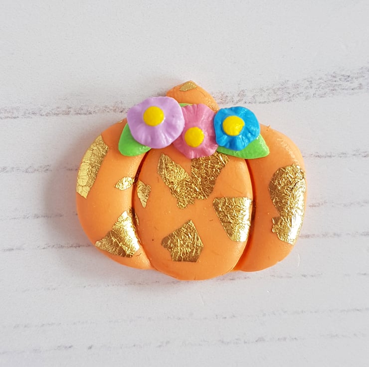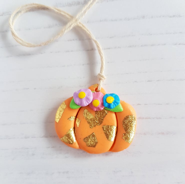A beautiful pumpkin themed decoration, made from orange polymer clay, with gold leaf carefully added by hand, along with some colourful flowers at the top. Sealed with a gloss to finish, this is a beautiful autumn piece for your home!