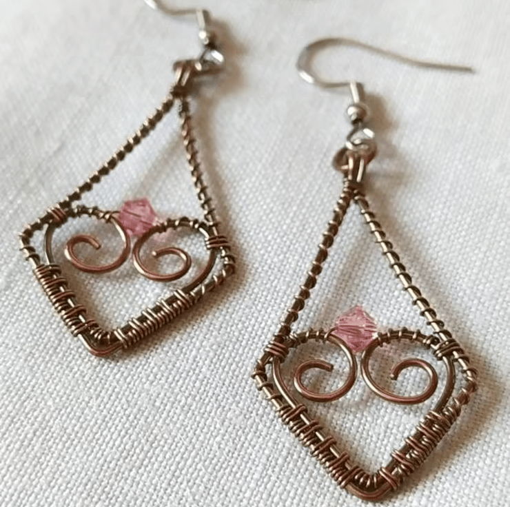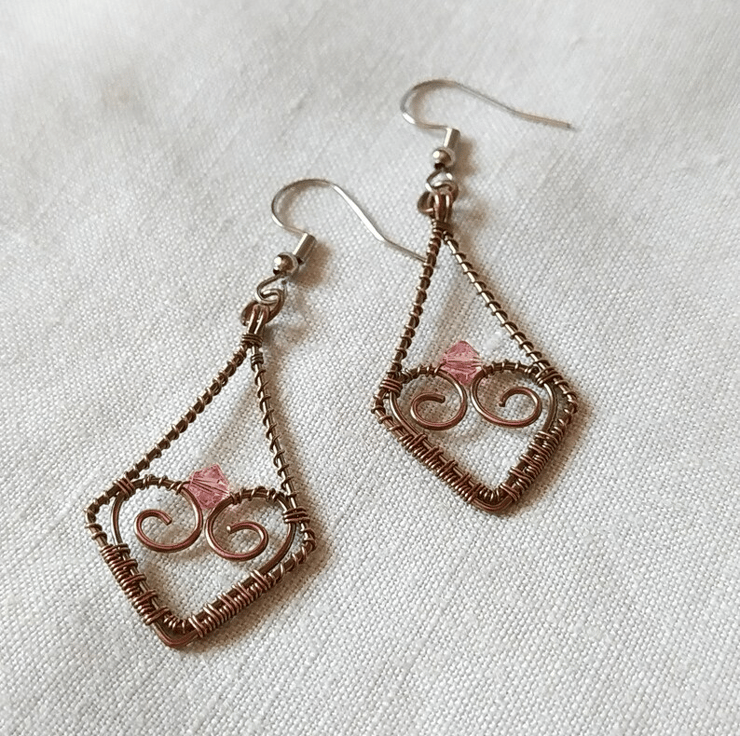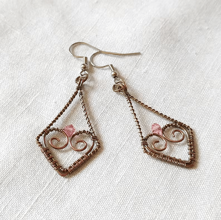 A pair of rhombus shaped wire wrapped earrings made from copper wire which has been oxidised.