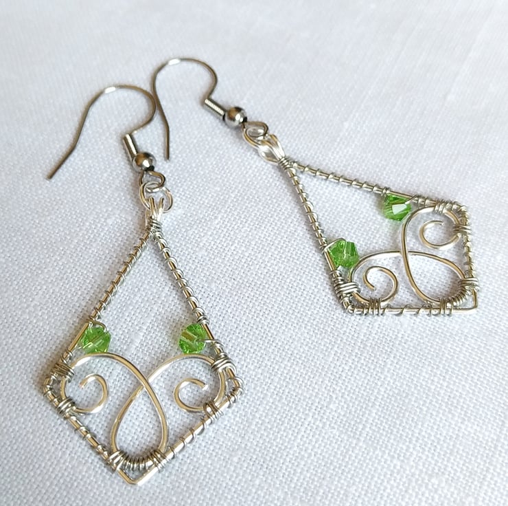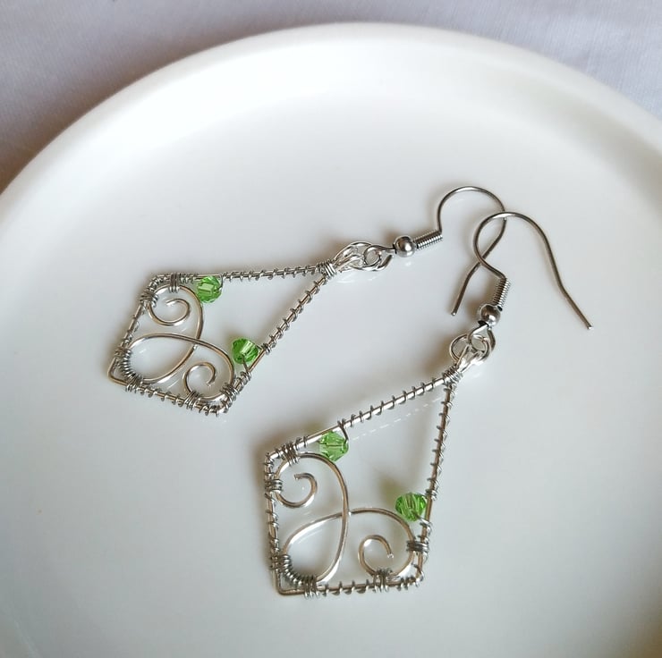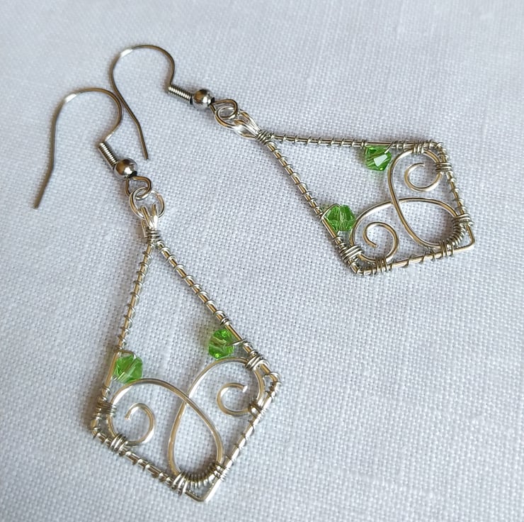 A pair of rhombus shaped wire wrapped earrings made from silver plated wires with a two tone effect.