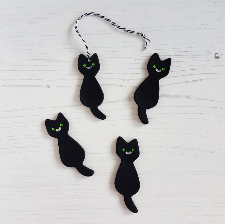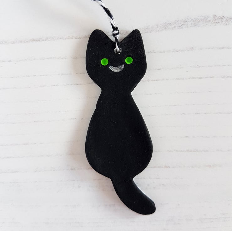 This listing is for a cute black cat, with bright green eyes and a silver smile!