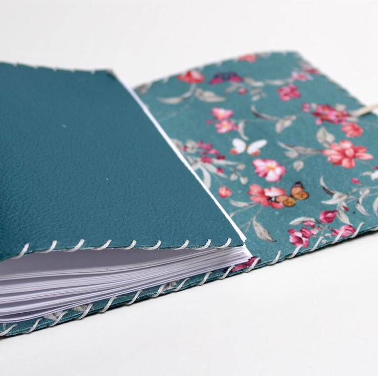 A6 Fold Over Blue green Leather handmade notebook floral fabric lining  paper