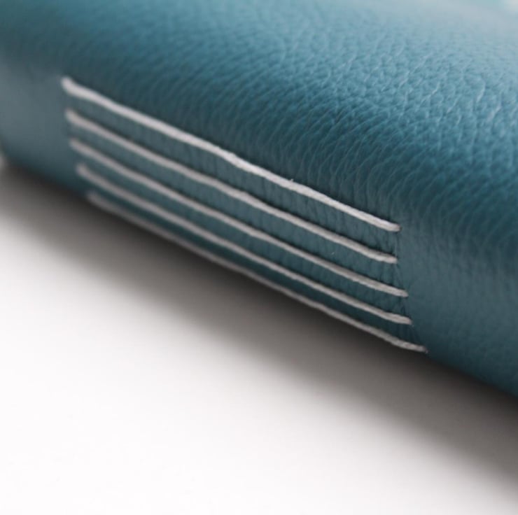 A lovely soft and supple green/blue leather with a gorgeous green, pink and white floral fabric lining. The notebook is hand stitched around the edge with a white coloured thread and contains 200 blank sheets of plain paper which are then hand stitched to the leather in 5 signatures. The notebook is fastened with a suede cord tied loosely at the front.