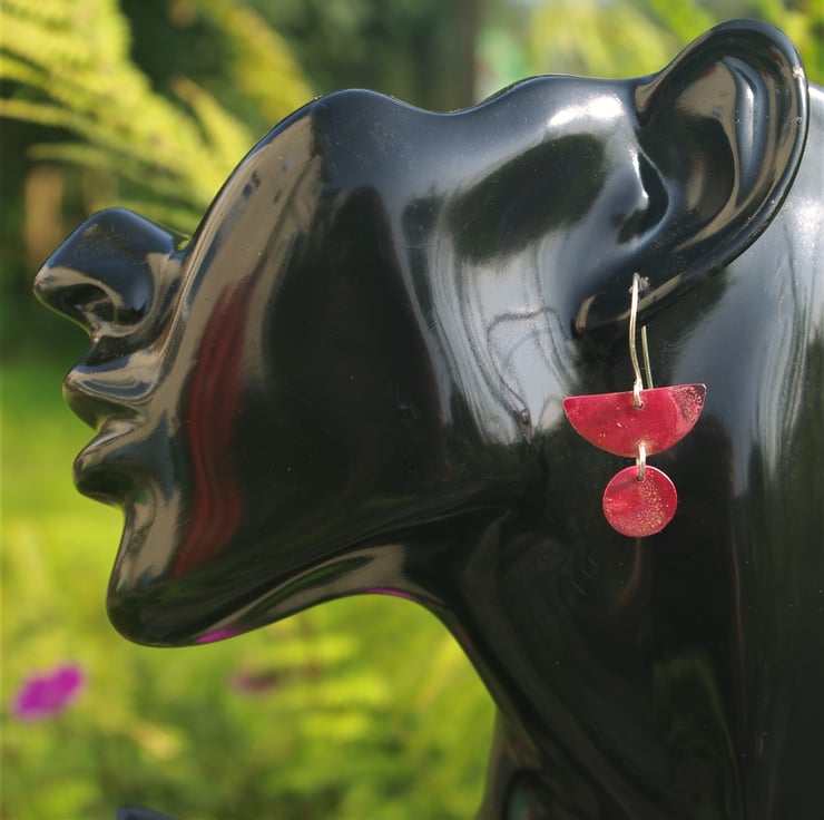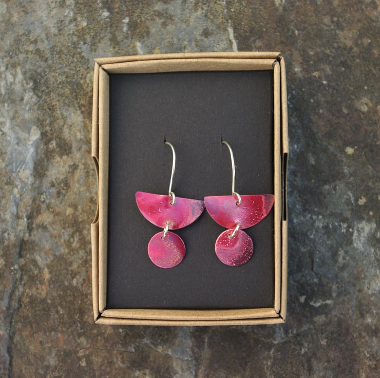 I have cut out half moon shapes from copper sheet these hang copper circles with a silver ring. The unique luscious red and purple tones and texture on the copper have been achieved by using heat, which is an exciting and unpredictable process , so all results are unique.