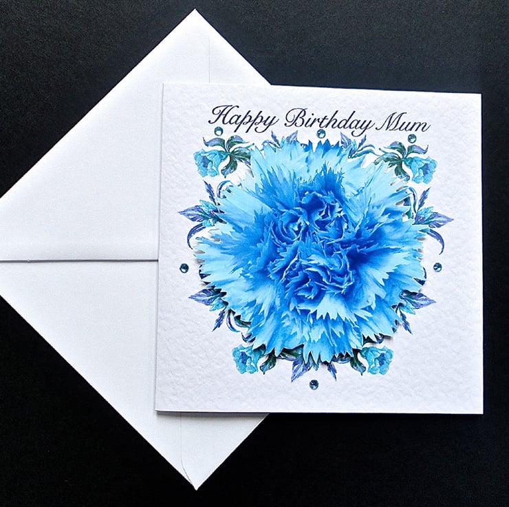 The flower head has been hand- cut and mounted in relief, placed centrally in an outer circle of hand painted flowers and leaves on a white card. Spaced between these are small blue glass gems and above it reads ‘Happy Birthday Mum’.