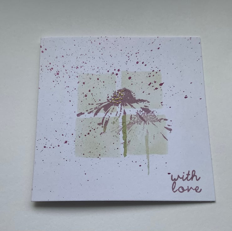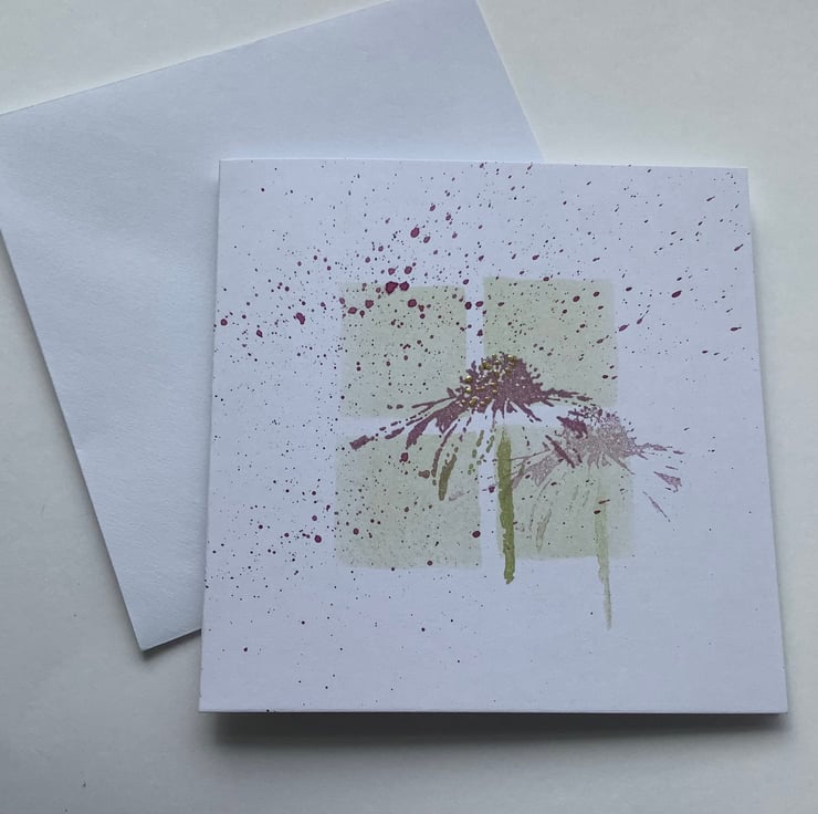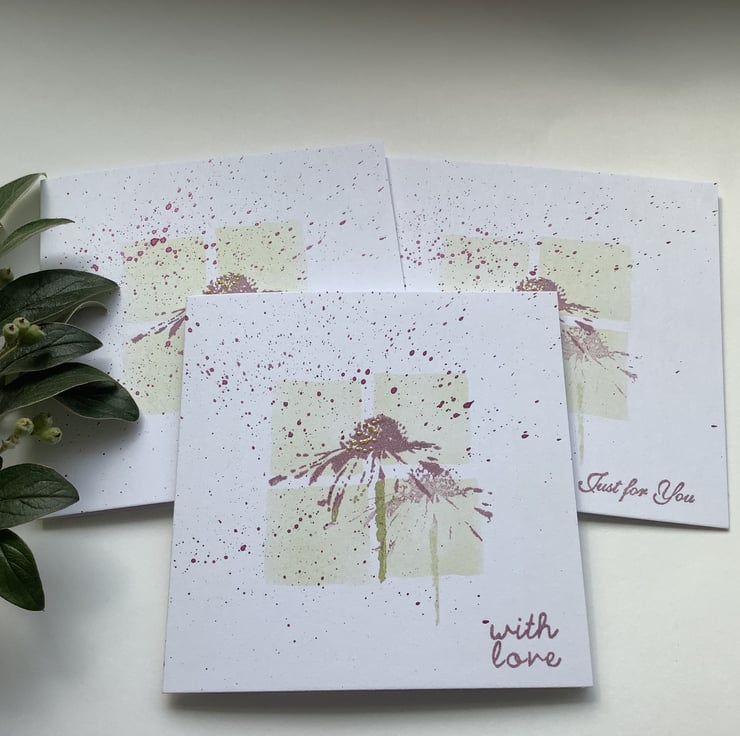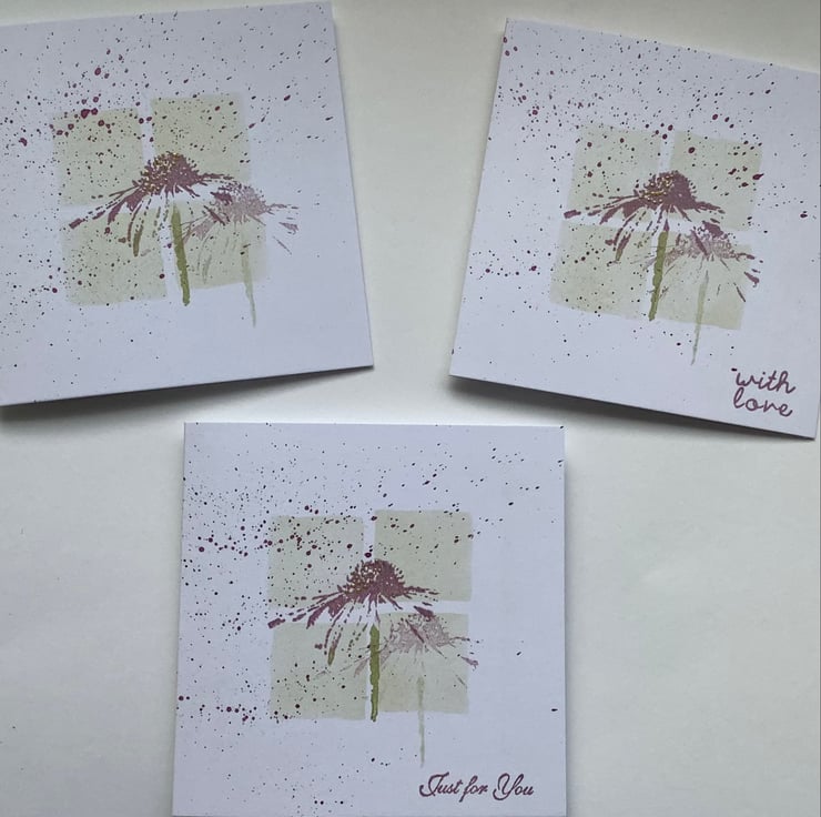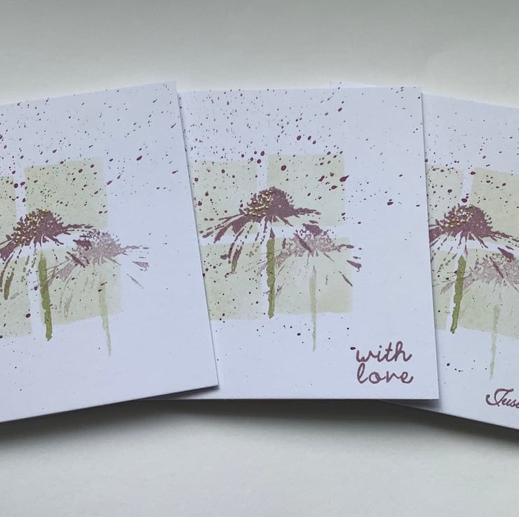 This is the ' Echinacea' set. Comprising of 3 handcrafted greetings cards / notecards (all the same Echinacea / Coneflower design ). Hand- stamped shimmery floral image, on a spritzed metallic watercolour and colourblock background . Various sentiments ( see below ) so they are therefore suitable for many different occasions .