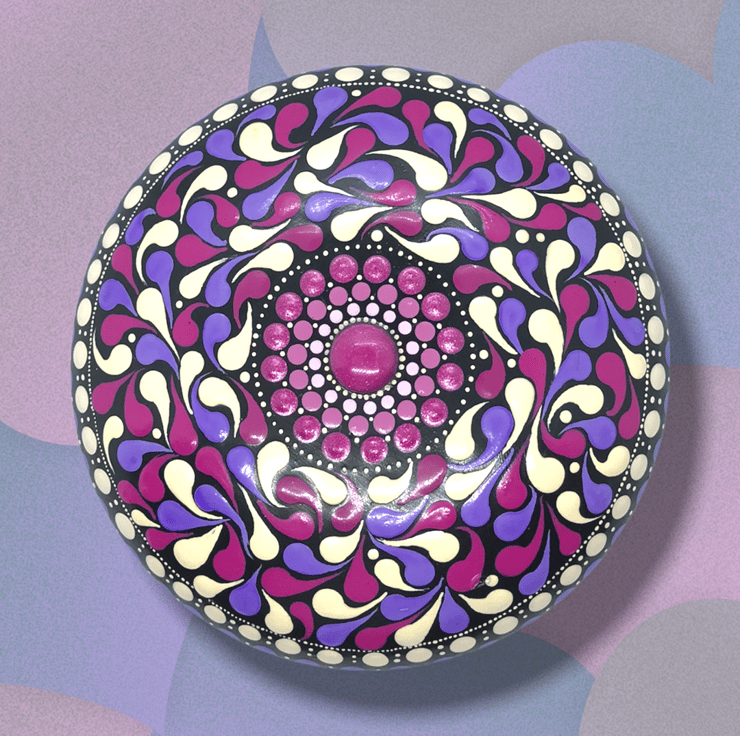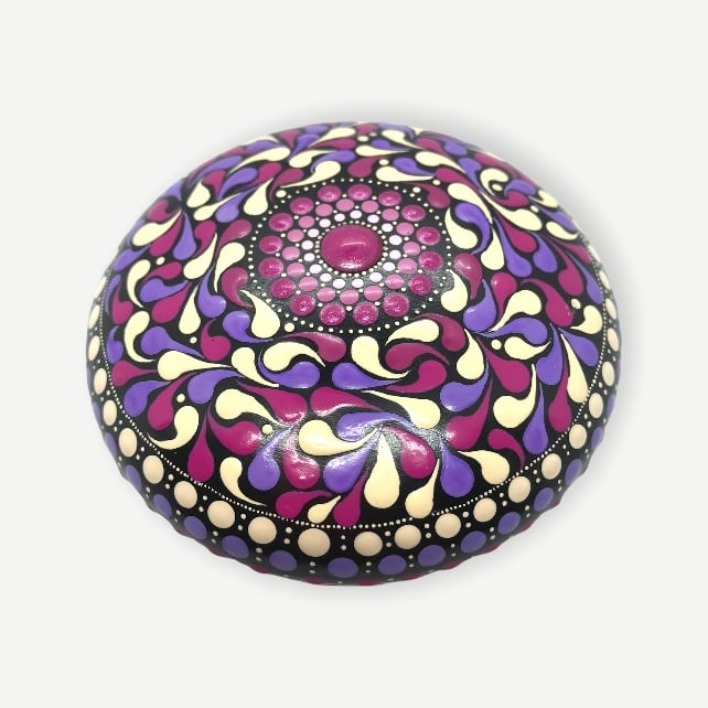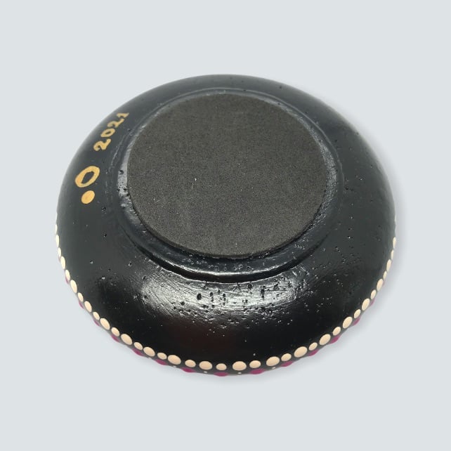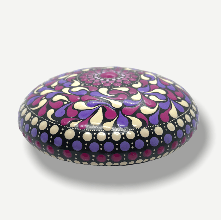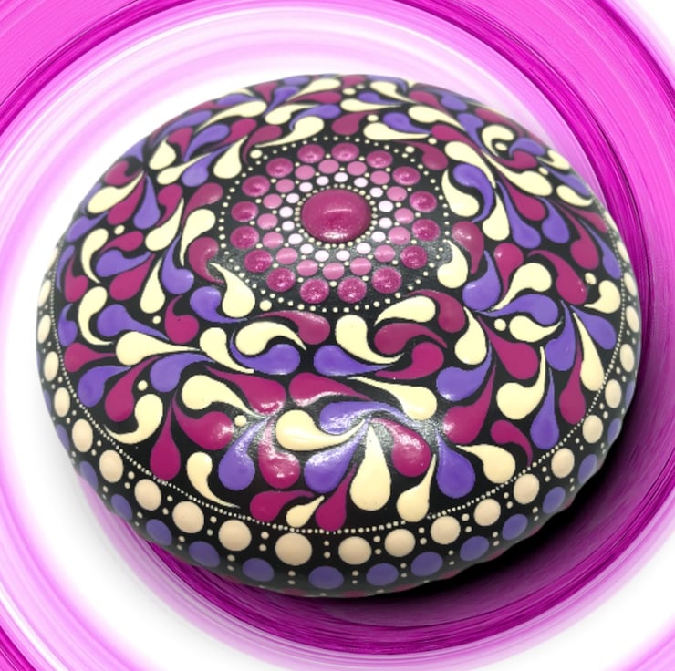 A handcrafted paperweight made from CrystalCal plaster and painted in magenta and mauve, featuring a pattern of swirls and swoops. The diameter of this piece is 11cm and the height is 3cm. It weighs 270g. It has been finished with satin varnish for a subtle sheen. I have affixed a non-scratch backing pad to the reverse to protect any surface that it may be placed upon.