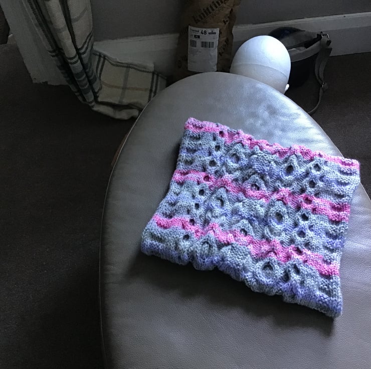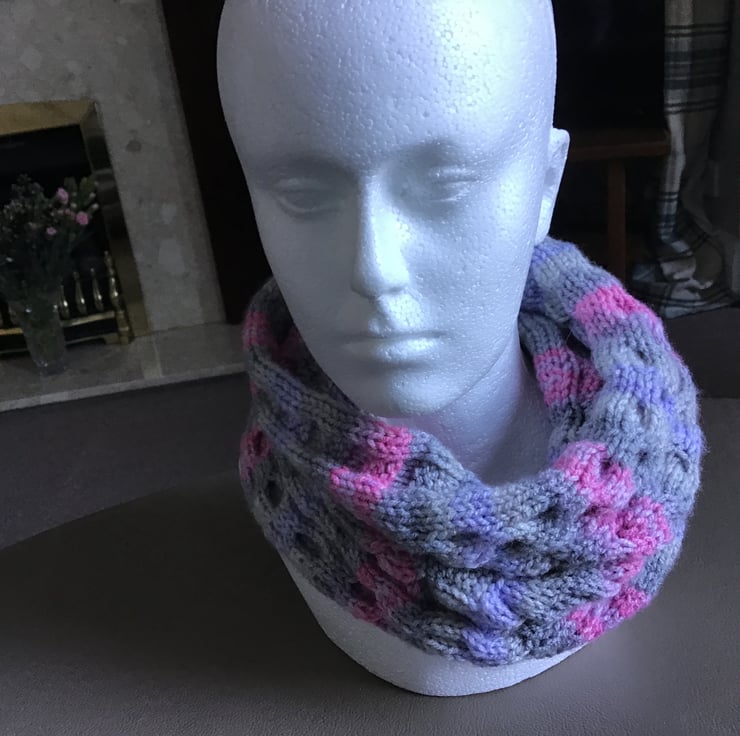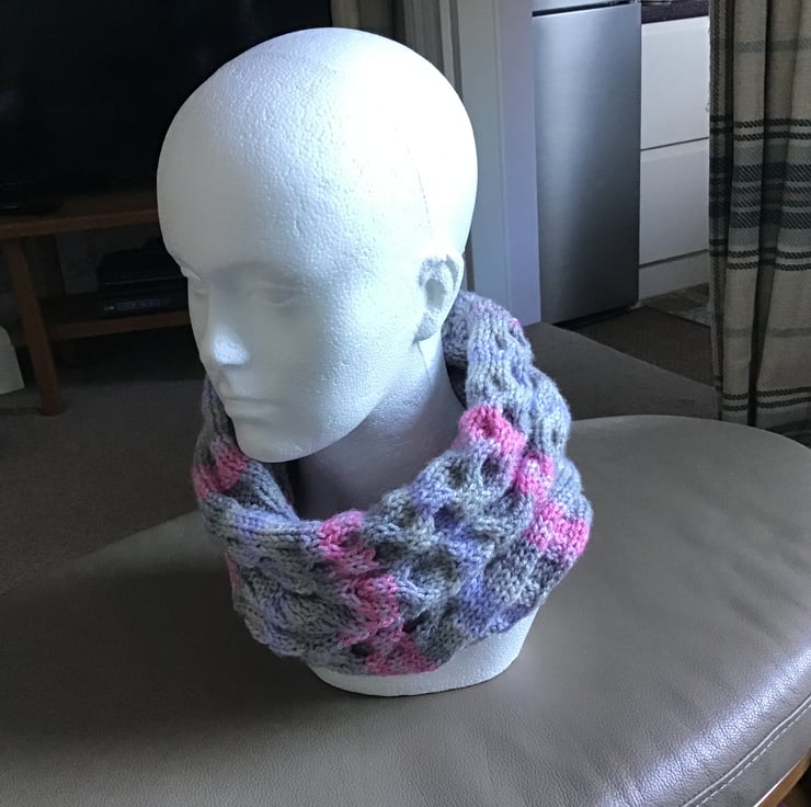 Hand knitted with an interesting cable design in a multi coloured yarn of greys pinks and blues