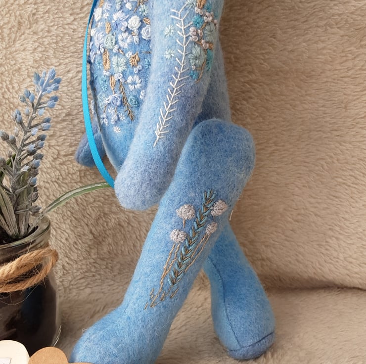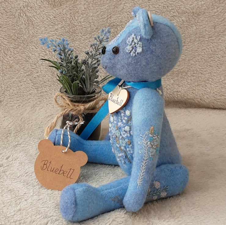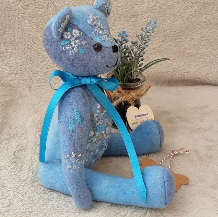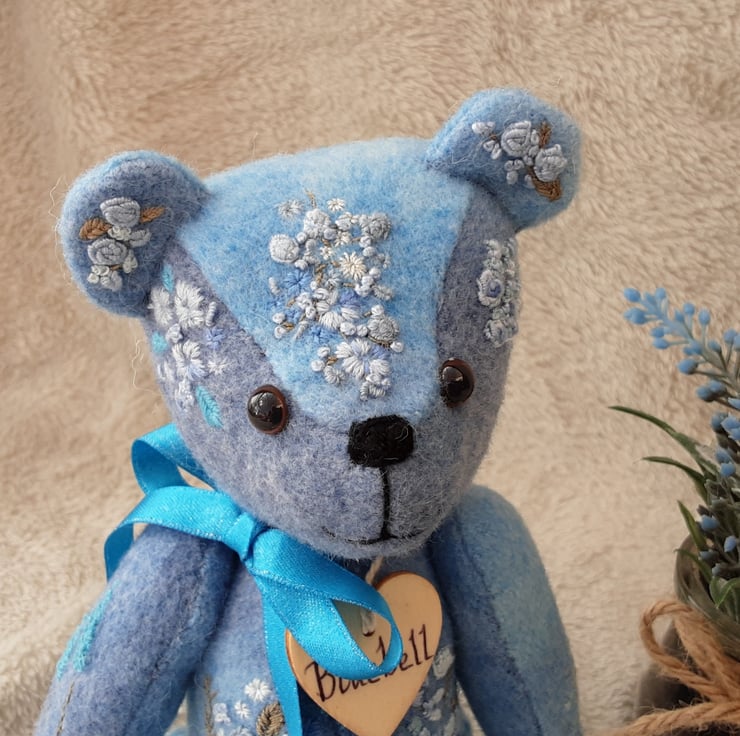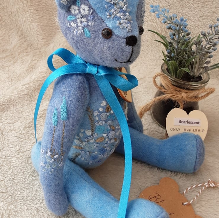 Beautifully detailed with floral hand embroidery to her body pieces in various shades of blue, she is highly detailed making her a unique keepsake bear.,