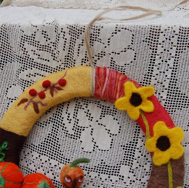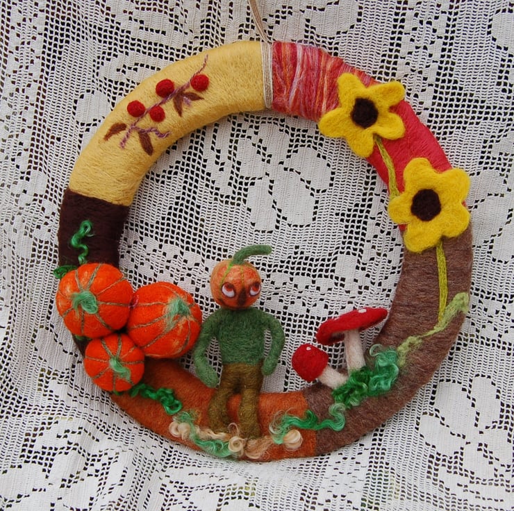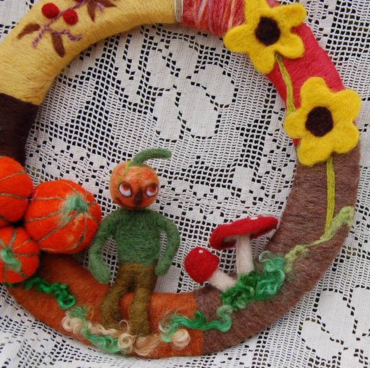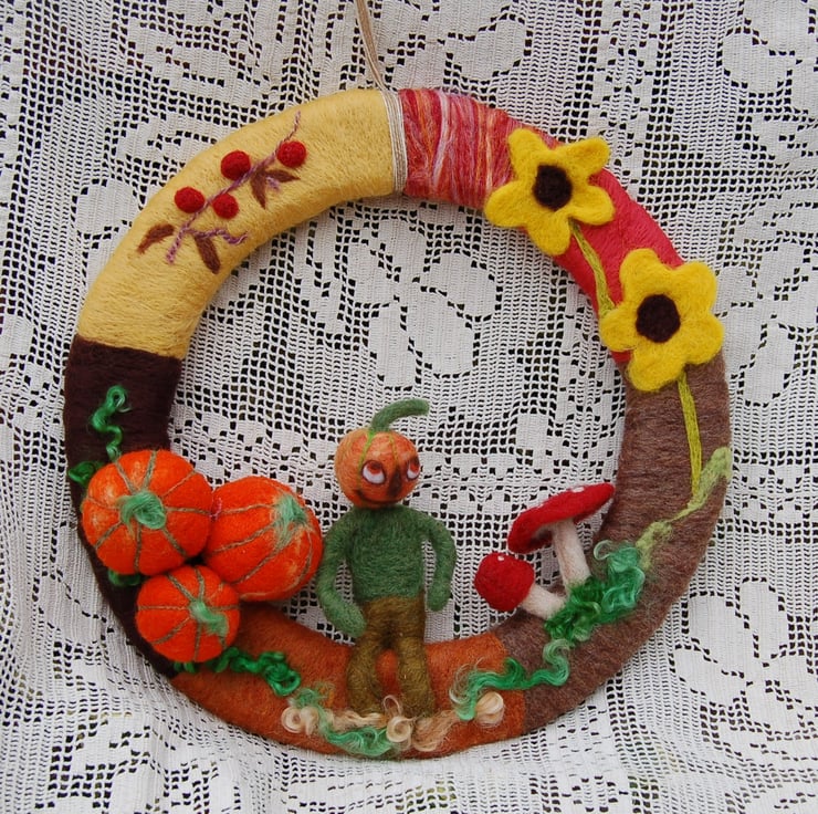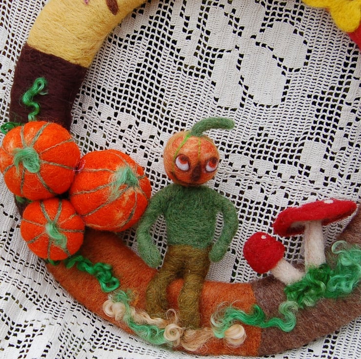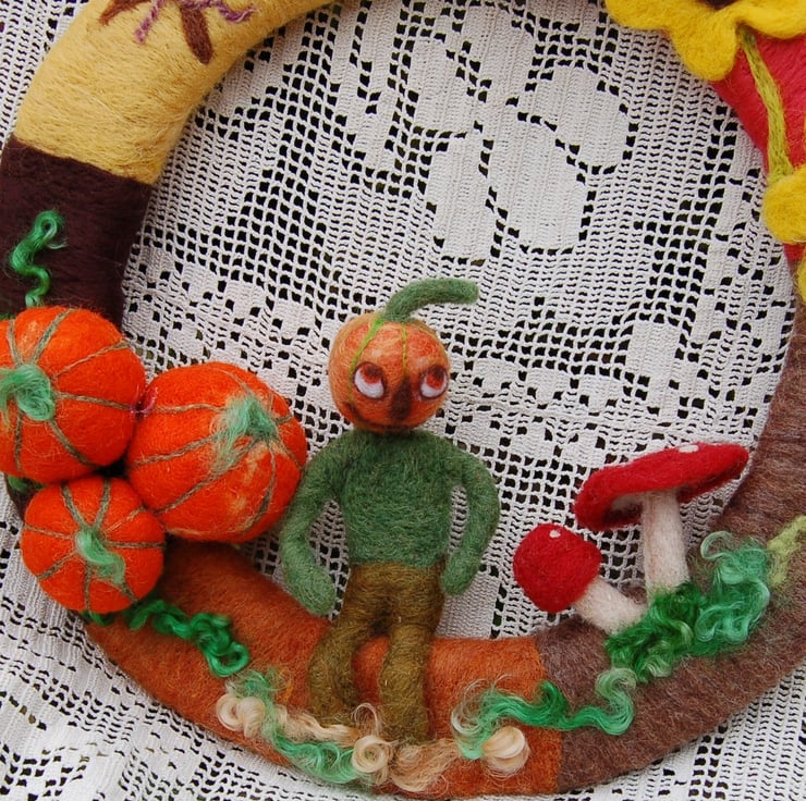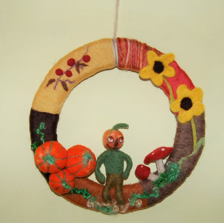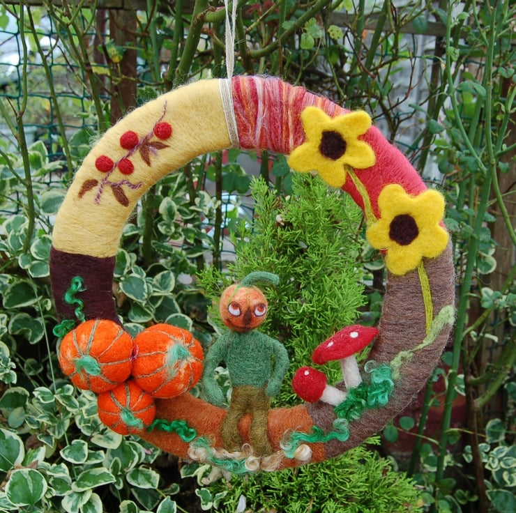 The frame is a wire hoop, covered with wool. .Onto this base are attached individual decorations I have made. All the decorations are wool and have been made using the needle felt method The pumpkin elf is in the bottom centre. To one side are three pumpkins. Above the pumpkins is a branch with Autumn berries and a few leaves. At the other side of the pumpkin elf are two fly agaric mushrooms and two sunflowers. Wool curls represent moss and ferns.