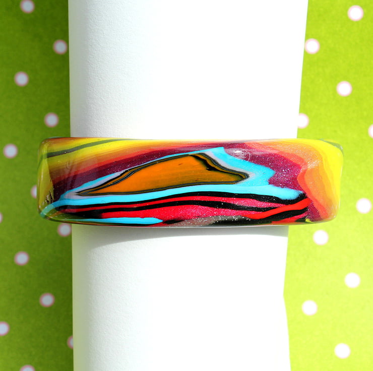 This is a unique piece - very original - made by myself and ready to go. It is crafted entirely from polymer clay - excellent lightweight and hard-wearing stuff that will keep those lush tones forever. The bangle has been shined and polished to a high degree.