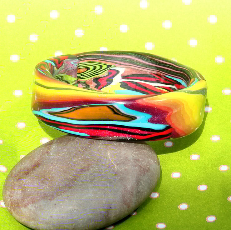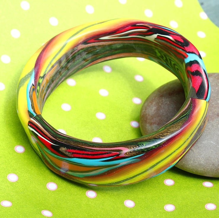 This is a unique piece - very original - made by myself and ready to go. It is crafted entirely from polymer clay - excellent lightweight and hard-wearing stuff that will keep those lush tones forever. The bangle has been shined and polished to a high degree.