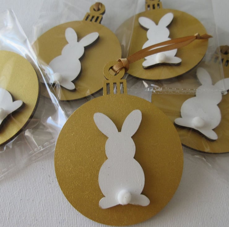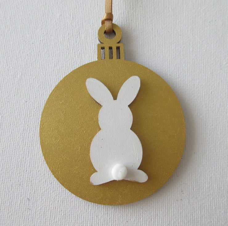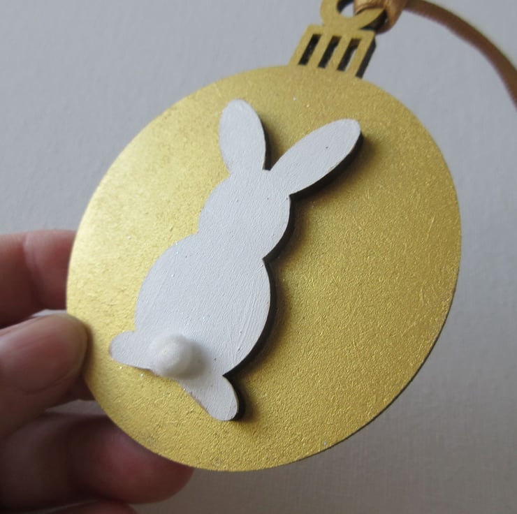 This is a 2D wooden bauble shape, with the background hand painted, and embellished with a wooden bunny.