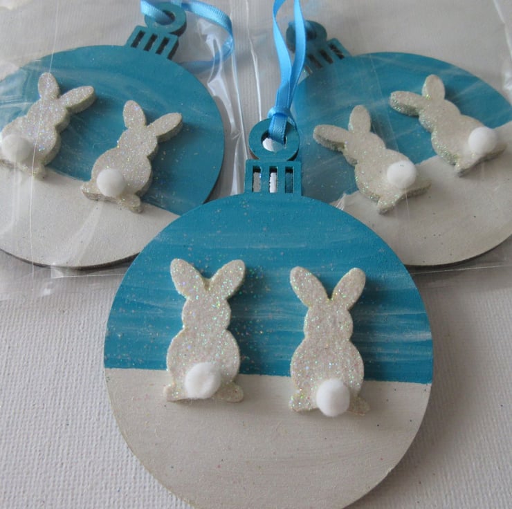 This is a 2D wooden bauble shape, with the background hand painted, and embellished with a pair of wooden painted bunnies.