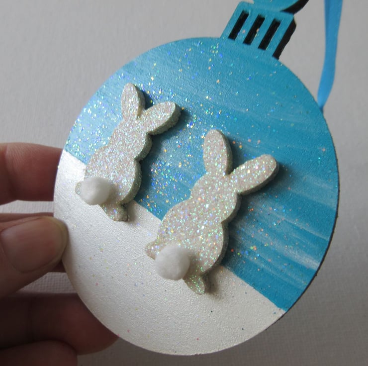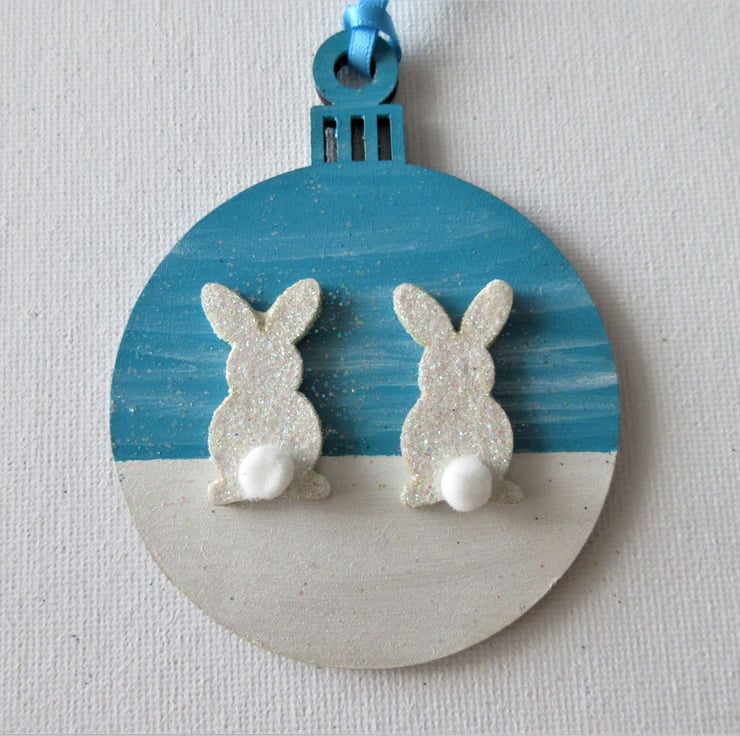 Hanging Decoration Christmas Tree Bauble Bunny Rabbit Blue White Snow Scene