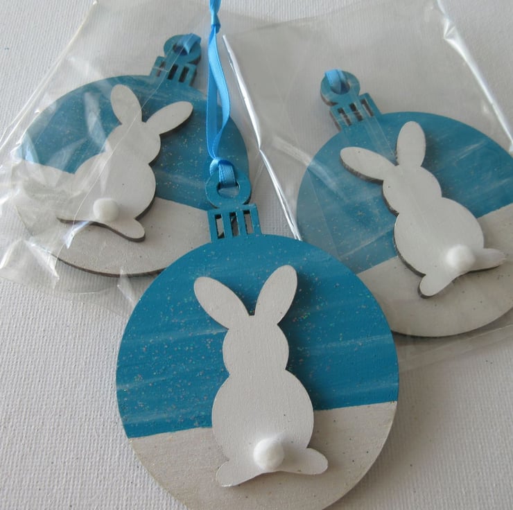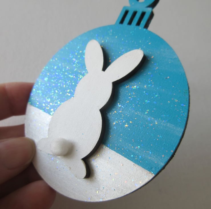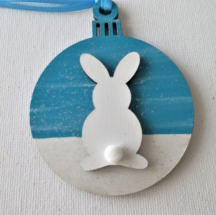 This is a 2D wooden bauble shape, with the background hand painted, and embellished with a wooden bunny.