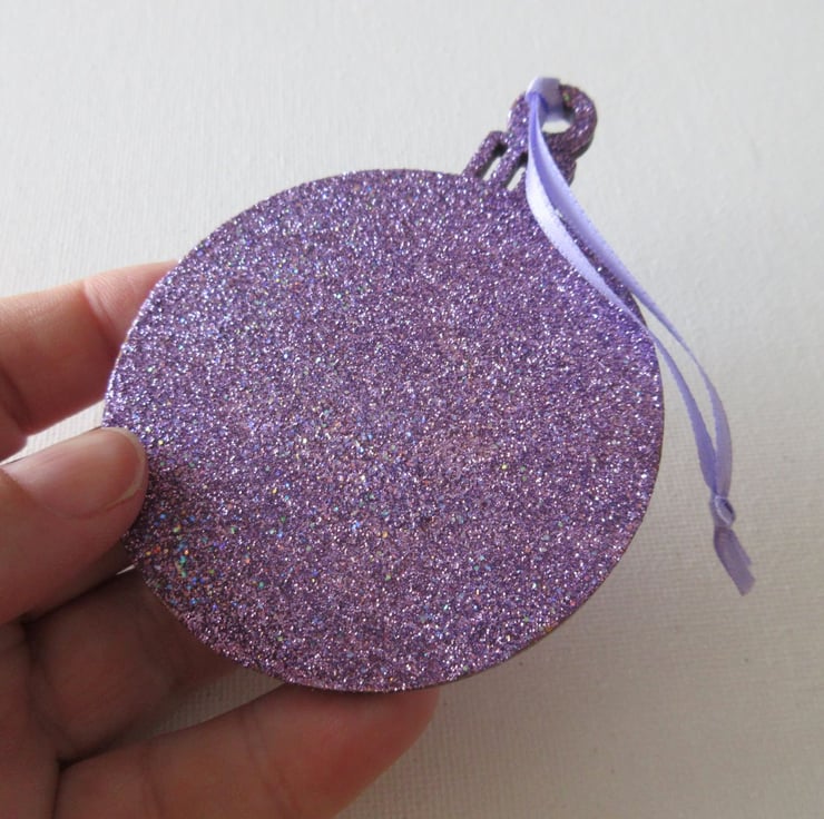 This is a 2D wooden bauble shape, with the background hand painted, and embellished with a wooden bunny with wings.
