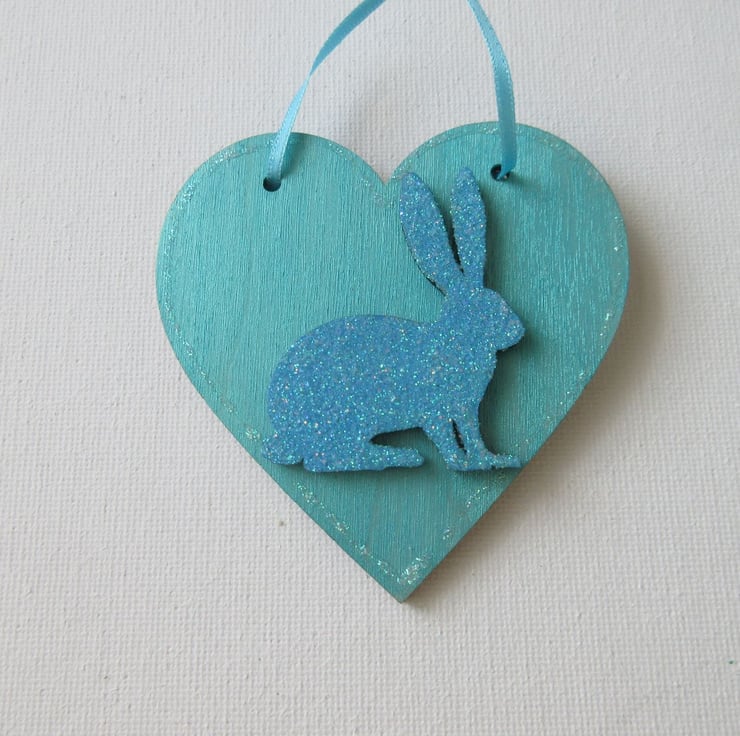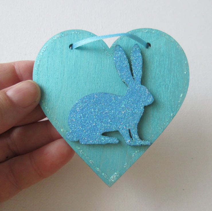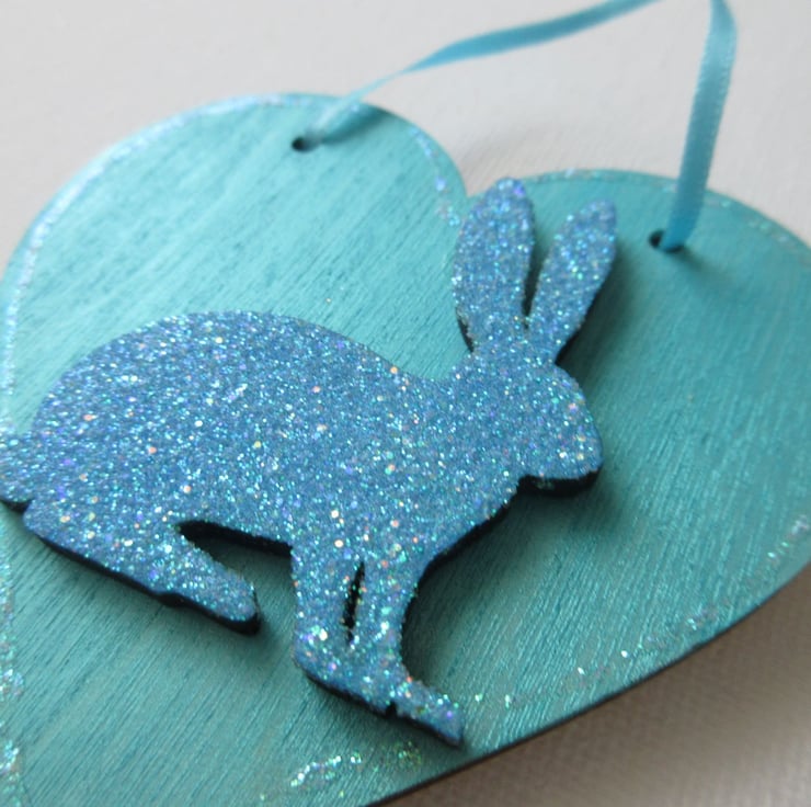 It has been embellished with a wooden bunny rabbit which has been coated in blue glitter and sealed.