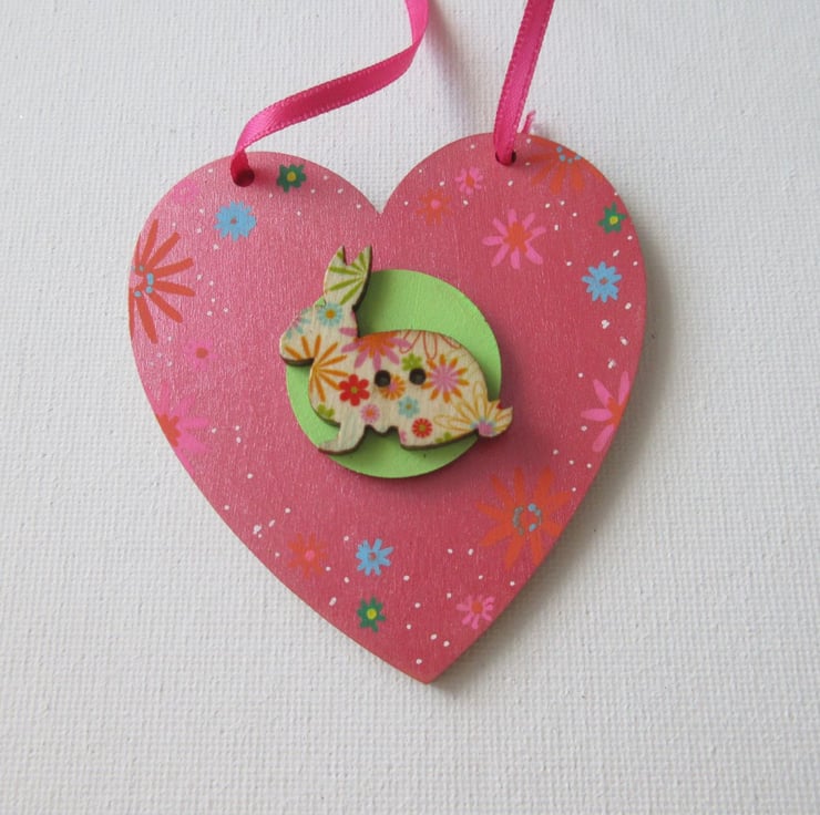 This is a wooden heart shape, which has been painted in a pretty light metallic red, with floral decoration.