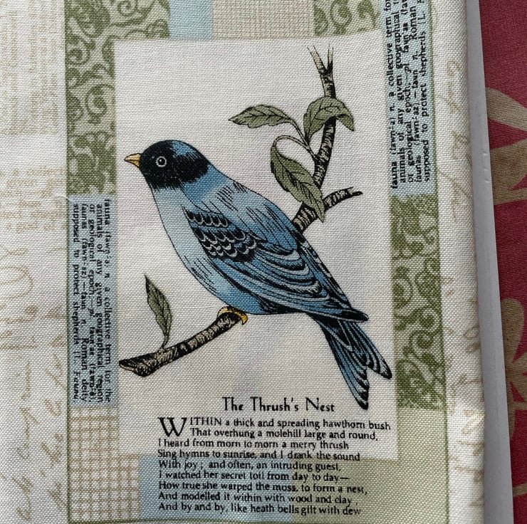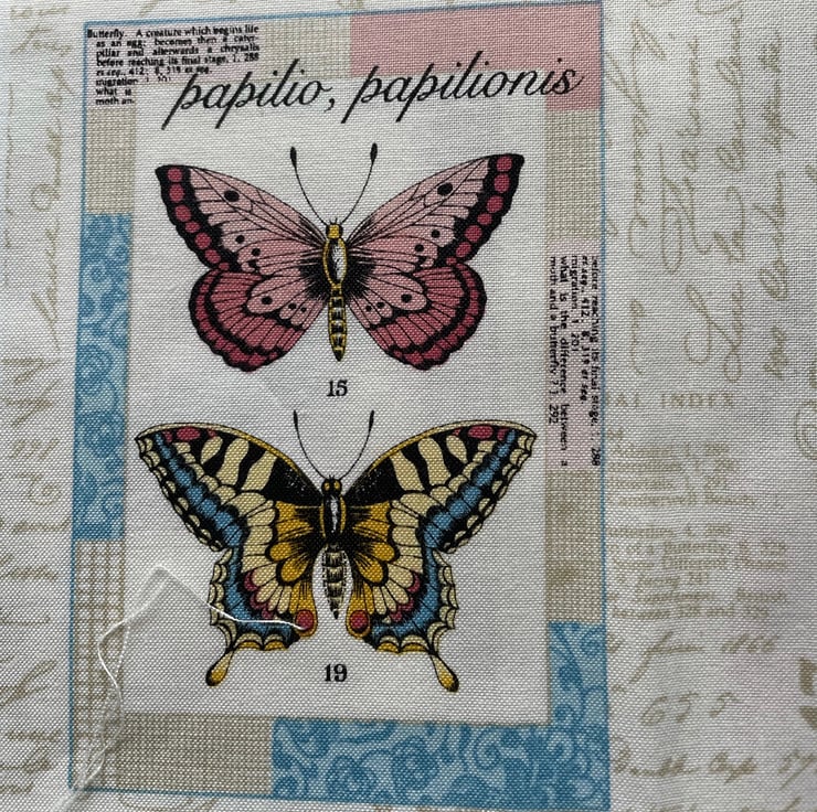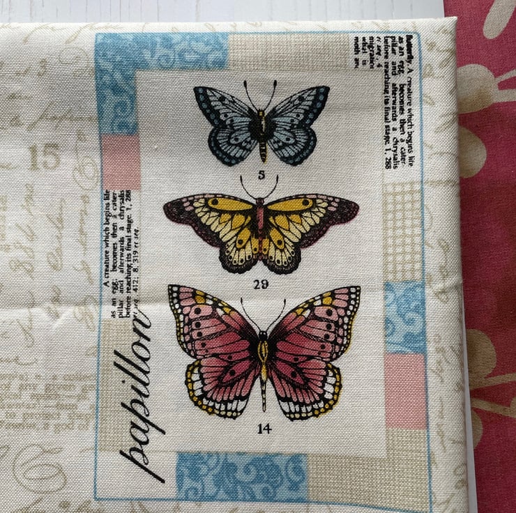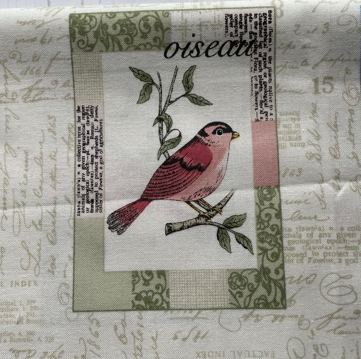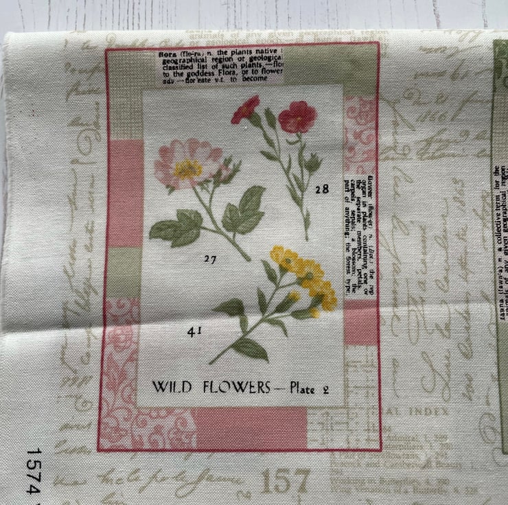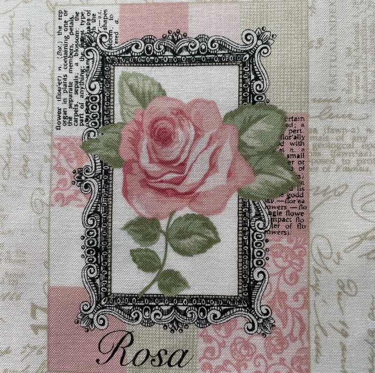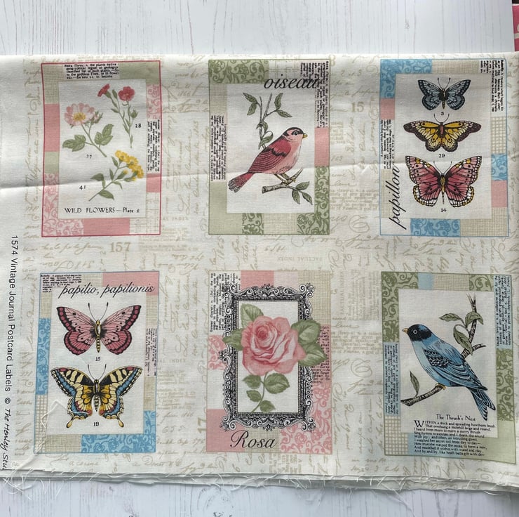 Set of 6 X 4 postcards as shown on a cream script background fabric. Would make a lovely cushion cover. Or cut into lavender sachets.