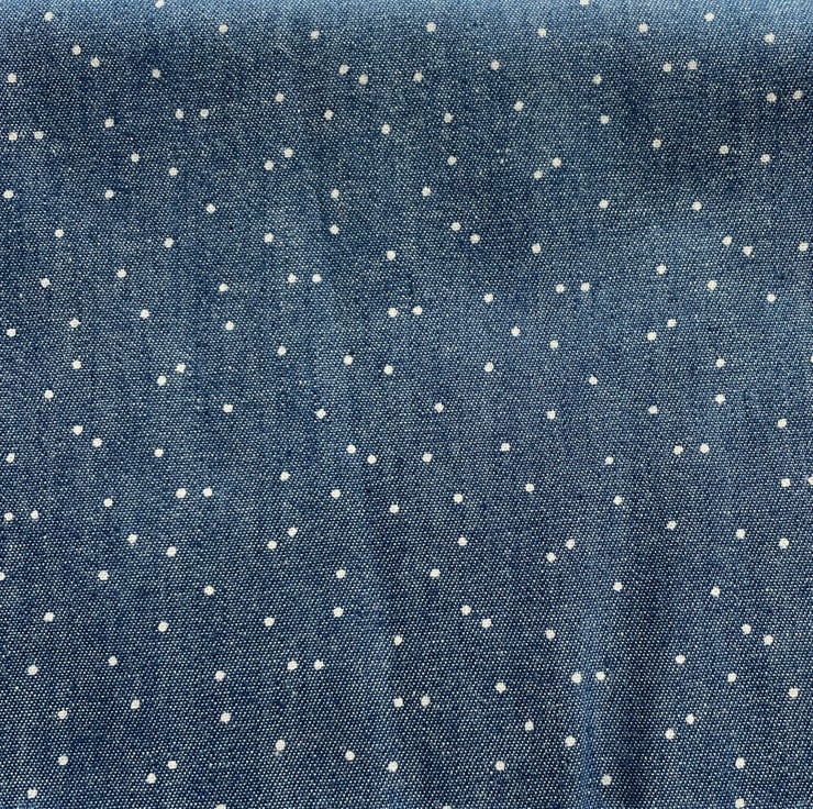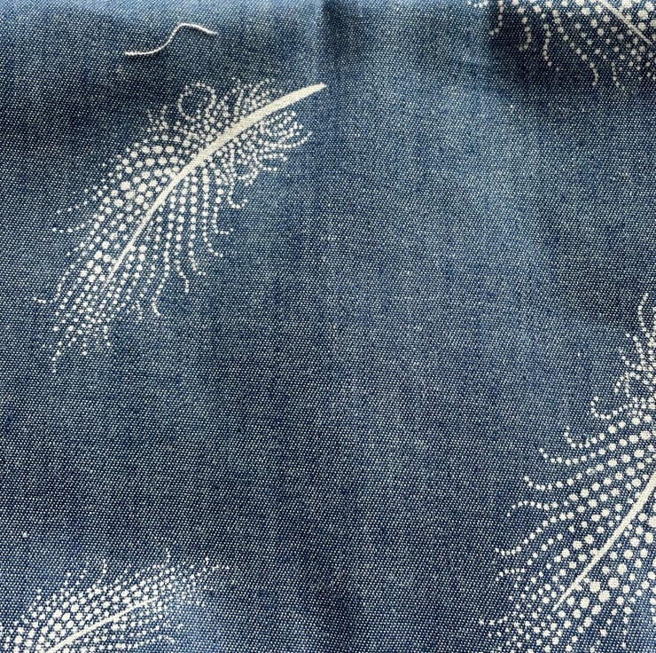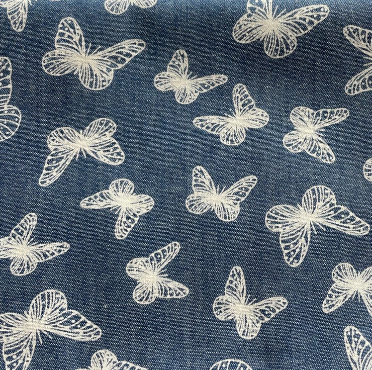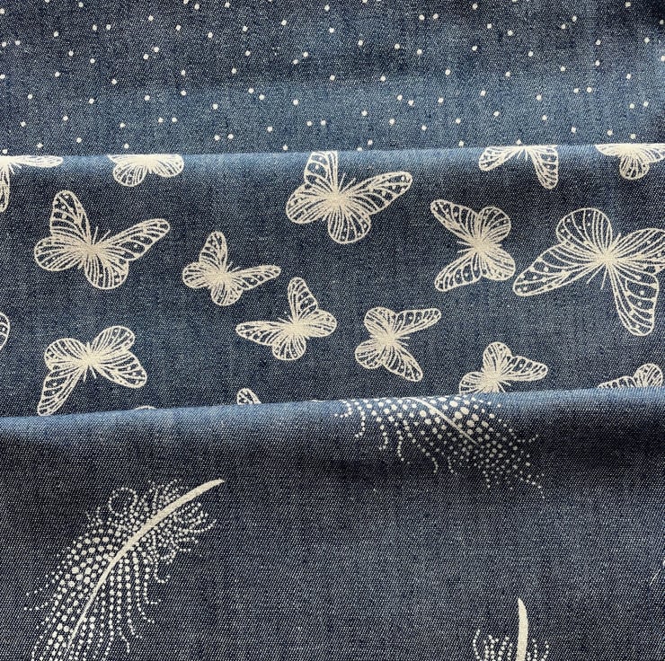 Lightweight denim fabric printed with dots, butterflies and feathers. 3 pieces in total.