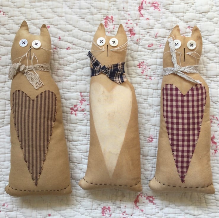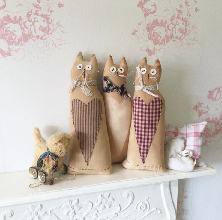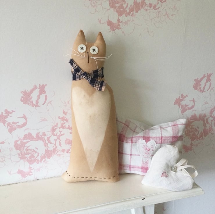 A primitive cat, made from tea stained calico and wearing a navy check collar. The front features a decorative stencilled heart.
