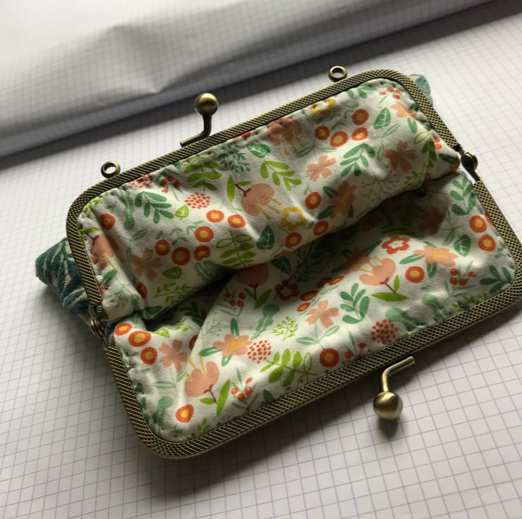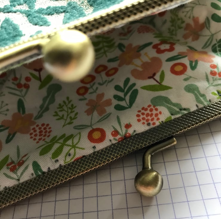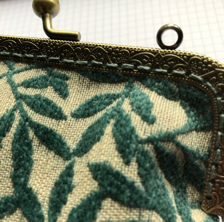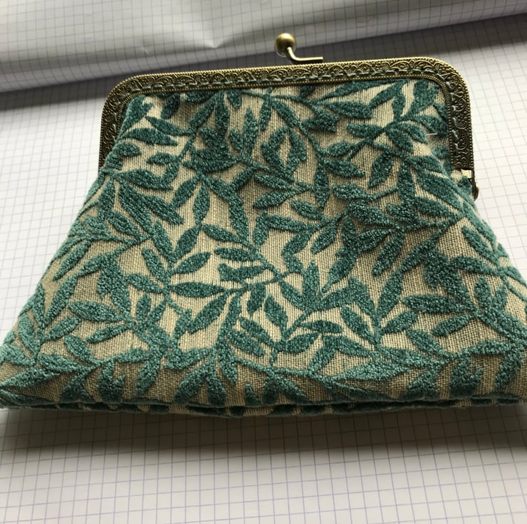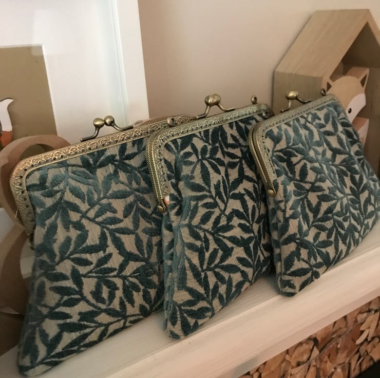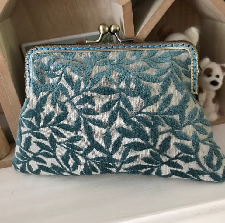 A beautiful clasp purse with a vintage feel about it. The fabric is a velour and just so soft and lush - I have limited amount of this fabric as it was from a sample "book" that was obtained from the supplier , via a recycle co. near me . I managed to get a few purses out of this shade and others are also on my Folksy page including a larger purse and a zipped bag. This one is a lovely shade of teal and has a funky botanic print, cotton lining. It would look great for a evening out or a special occasion. Just ready for a Christmas or a summer do. It is set in a 15cm antique brass effect clasp frame and has been sewn in with a complimentary teal shade of thread. The measurements are 20cm at the widest point and 14.5cm deep.