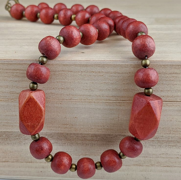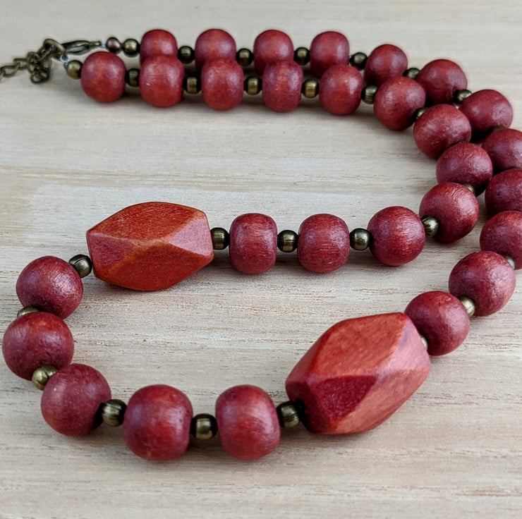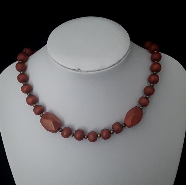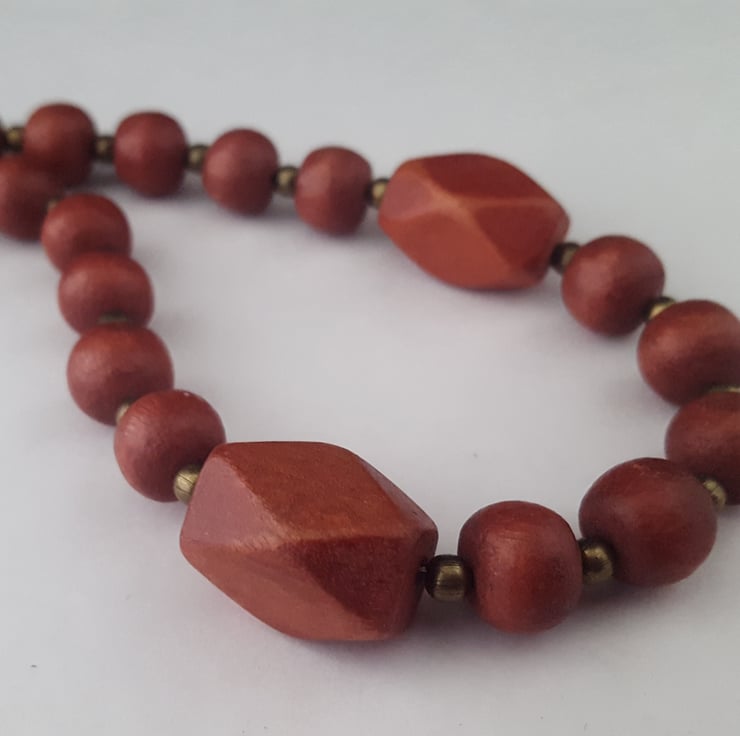 18" necklace of 20mm faceted and 10mm round reddish-brown wooden beads, with bronze tone ball spacers.