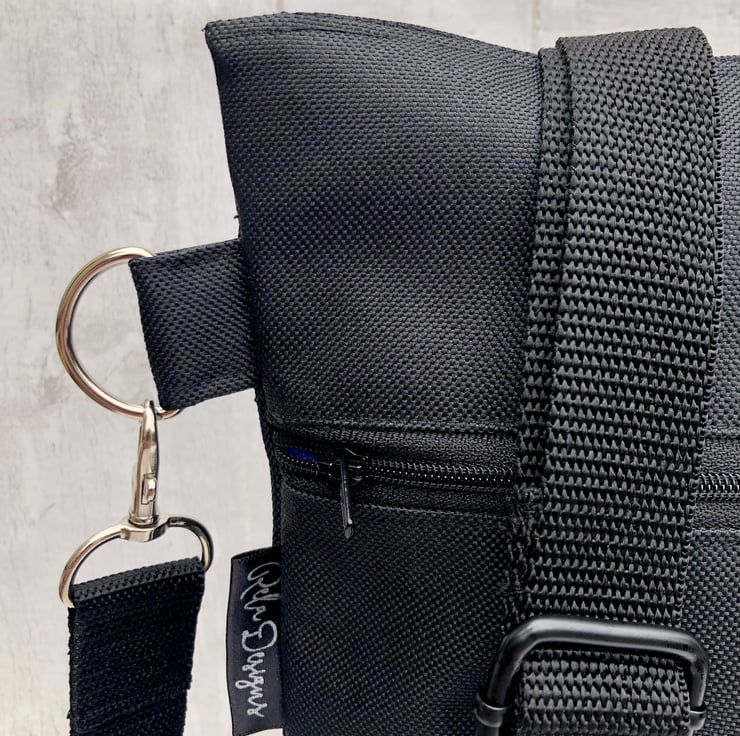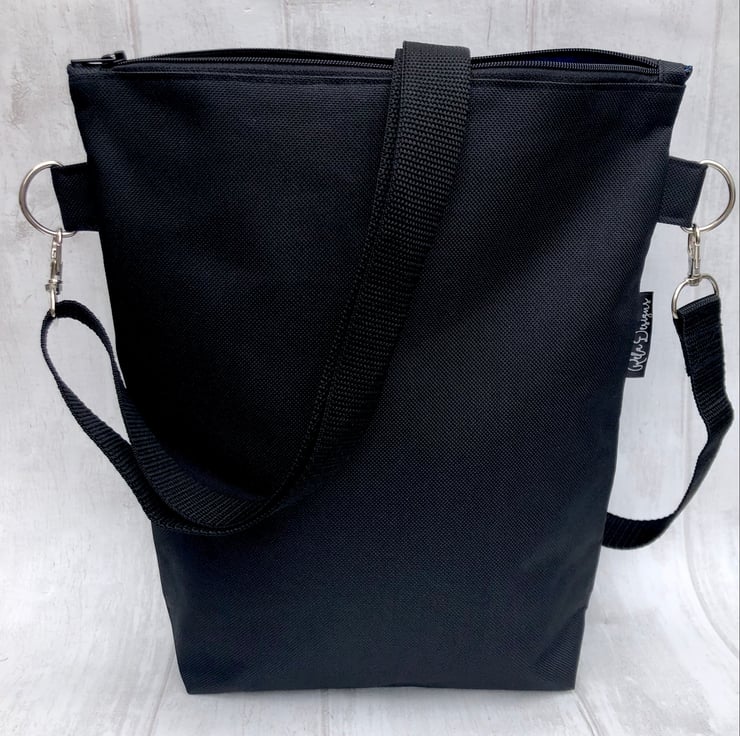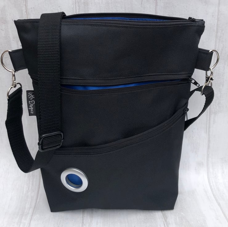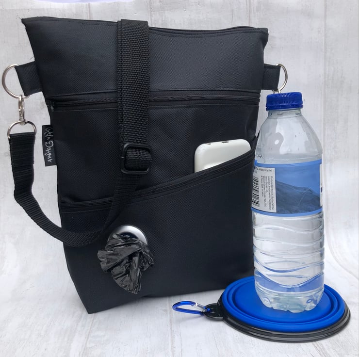 This black Dog walking bag is lined with a bright blue waterproof nylon lining. This handy bag will hold all your essentials for walking your dog.