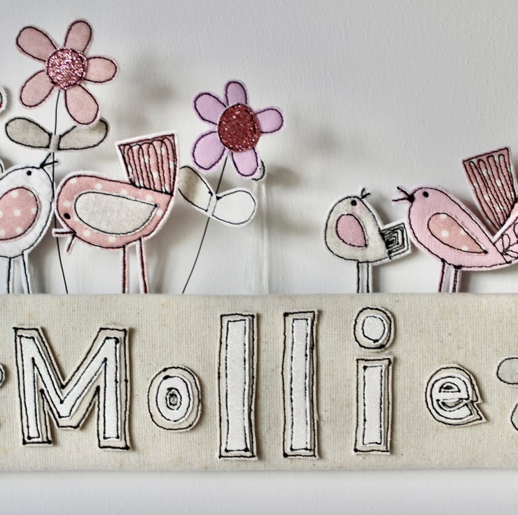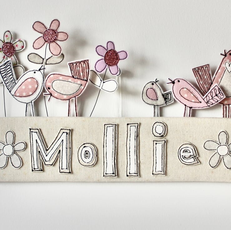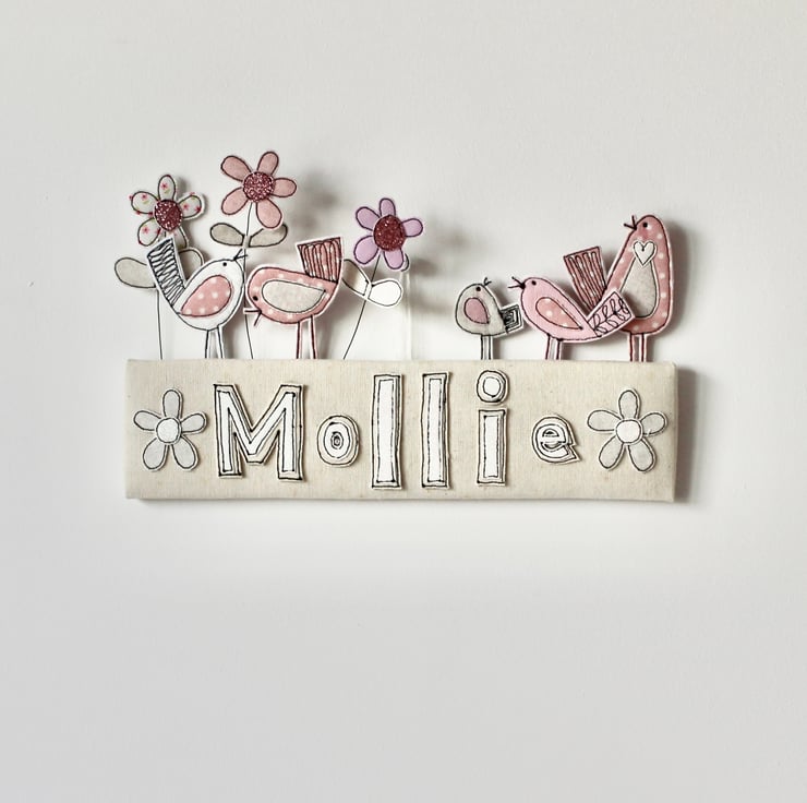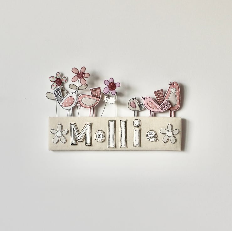 A padded cream coloured door plaque, proudly displays your chosen name with five birds and five flowers.